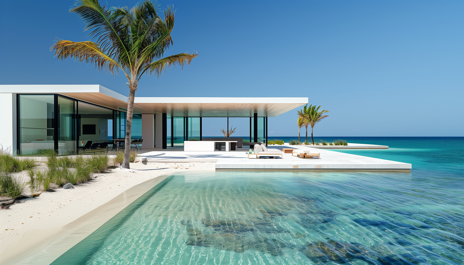 Luxurious modern beachfront villa with sleek design, glass windows, and a stunning ocean view. Perfect for relaxation and tropical living.