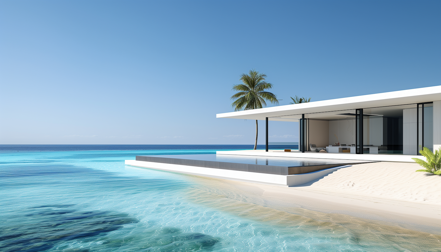 Modern beach house with infinity pool, glass walls, and ocean view. Minimalist design, palm trees, and sandy beach create a serene escape.