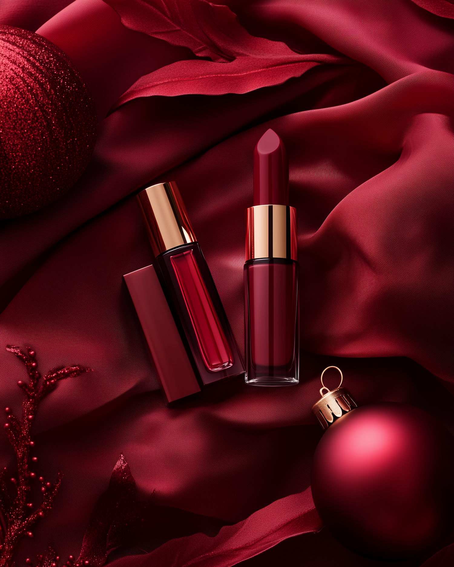 Luxurious red lipstick and gloss on silky fabric with festive ornaments, creating a rich, holiday-themed beauty scene.