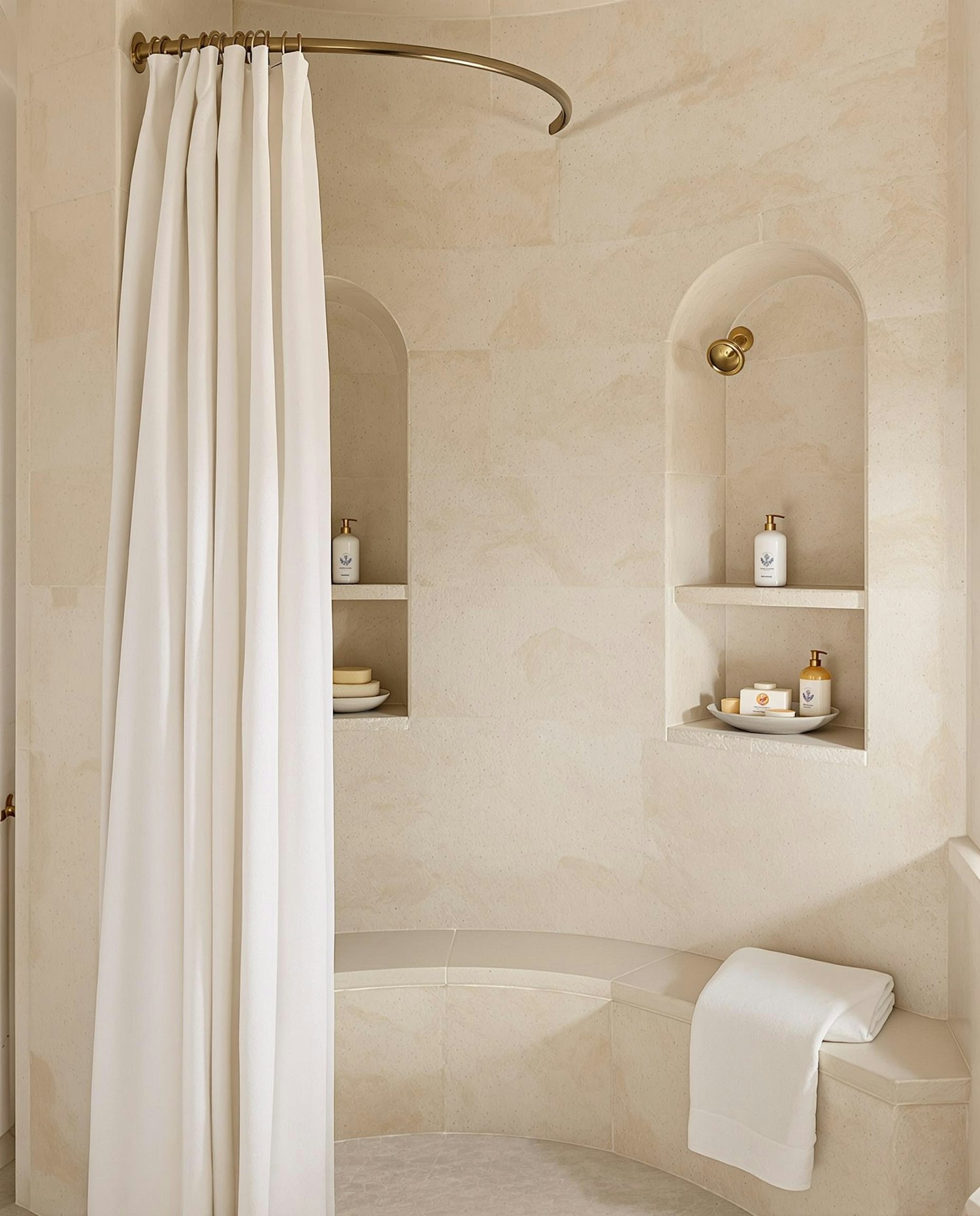Elegant beige bathroom with a curved shower rod, built-in alcove shelves, and a cozy bench with a white towel for a spa-like feel.