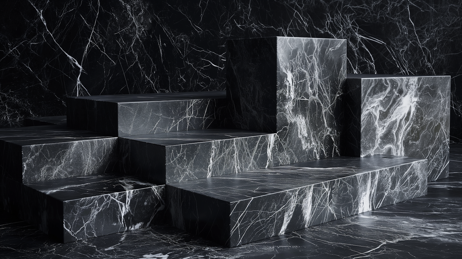 Elegant black marble blocks with white veining create a sophisticated geometric pattern, exuding luxury and modernity.