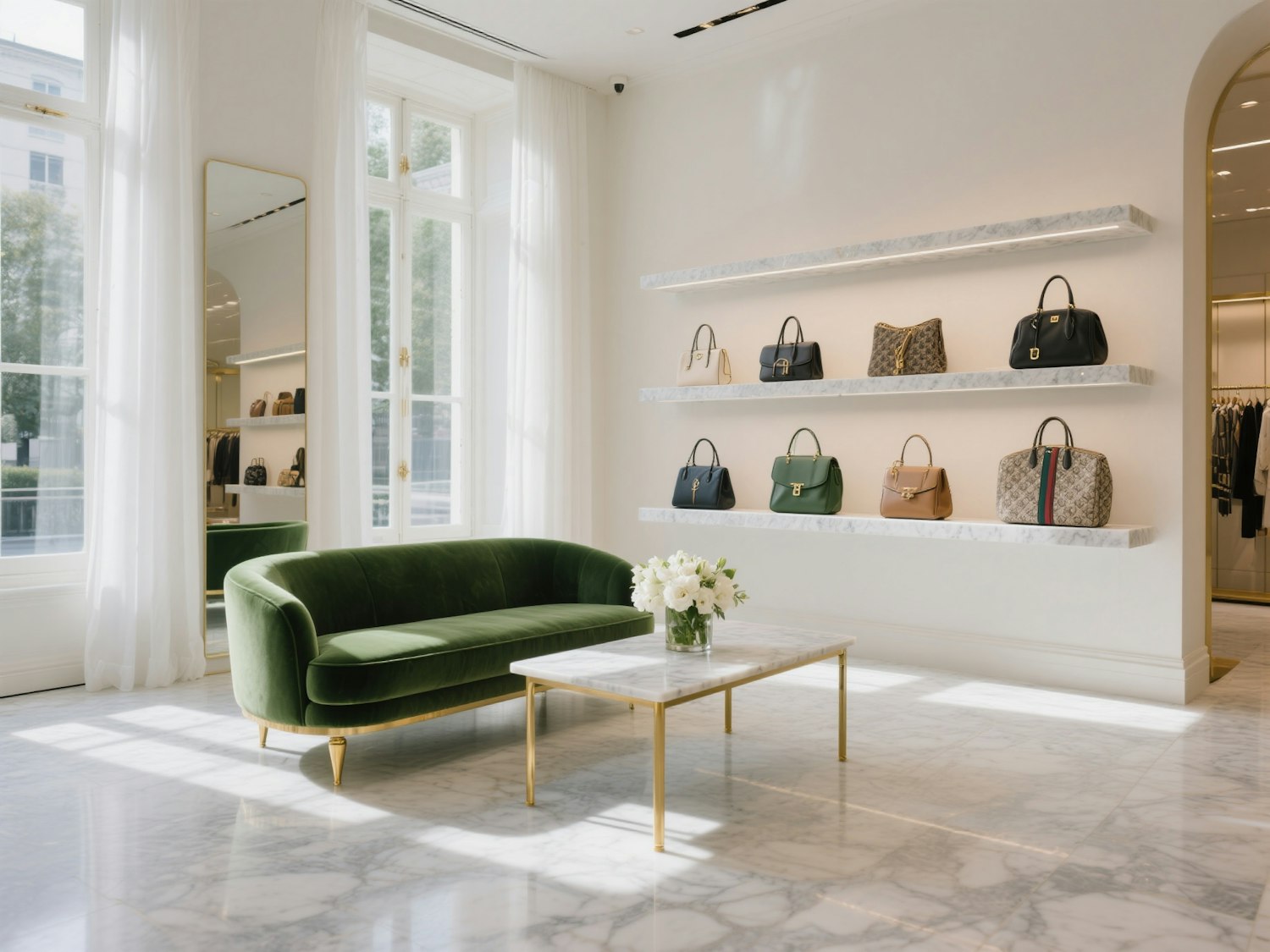 Elegant boutique interior with a green velvet sofa, marble shelves displaying designer handbags, and natural light from large windows.