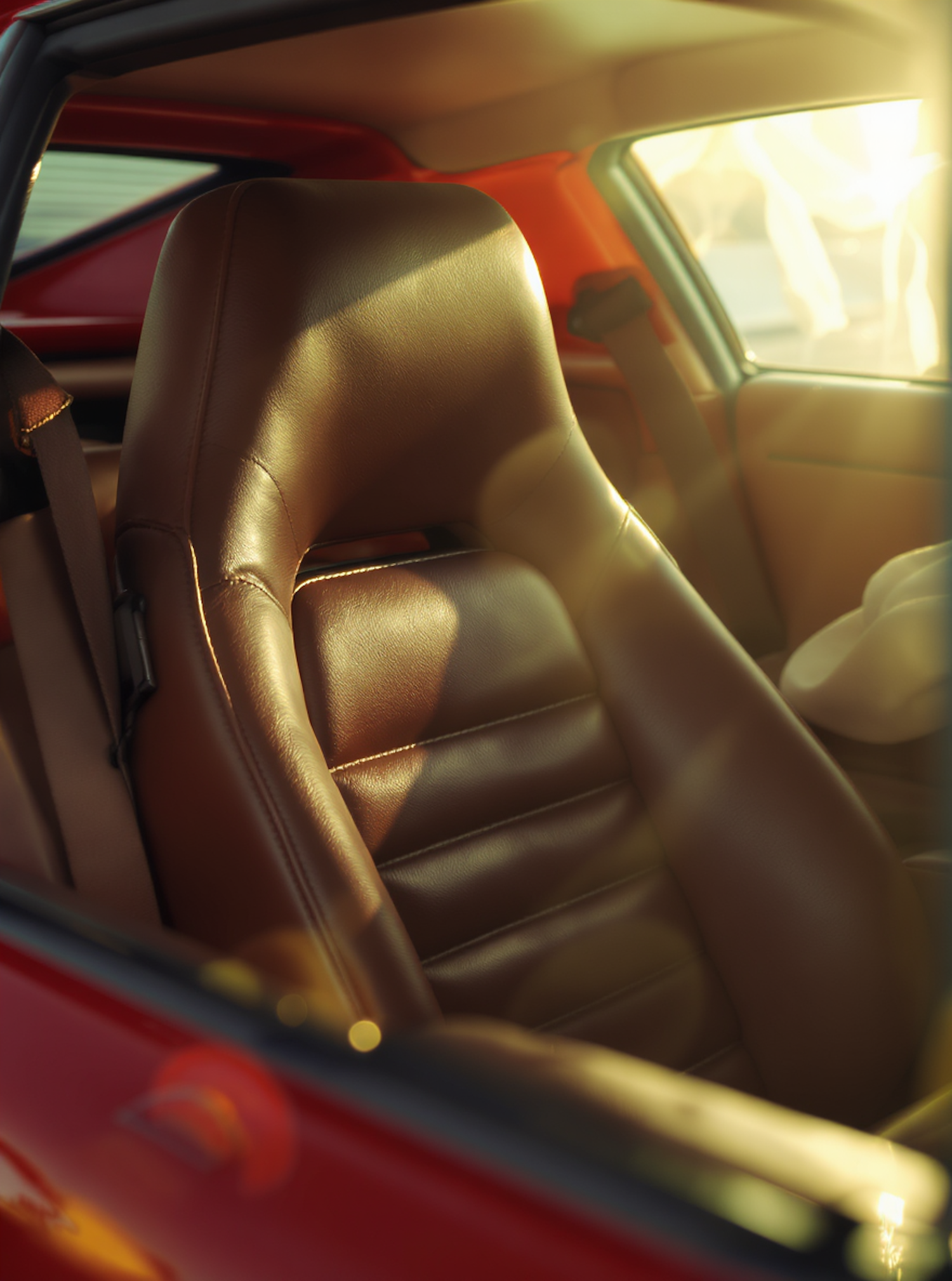 Close-up of a brown leather car seat bathed in warm sunlight, showcasing its ergonomic design and luxurious texture.