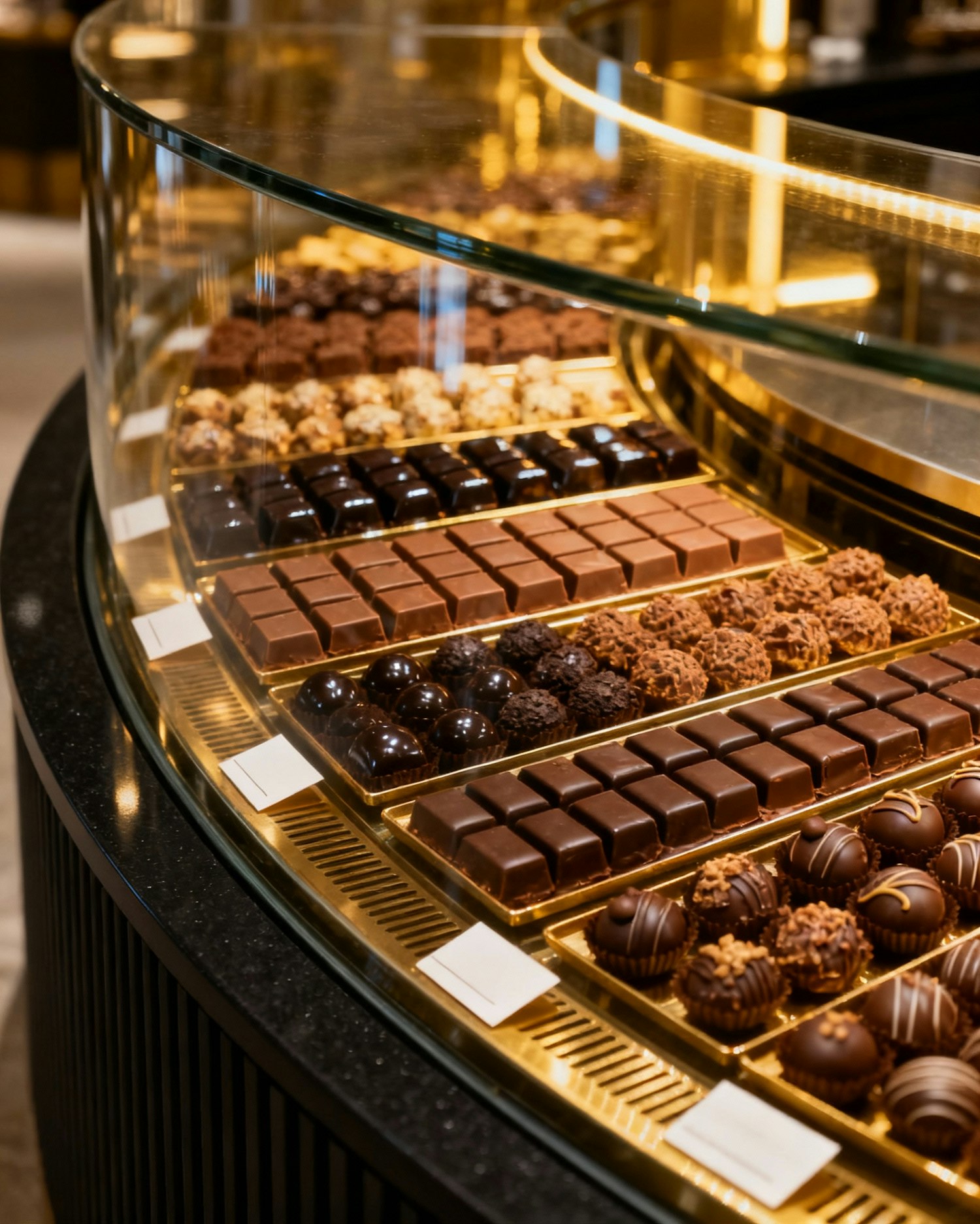 A luxurious chocolate display in a curved glass case, featuring assorted truffles and confections on golden trays under warm lighting.