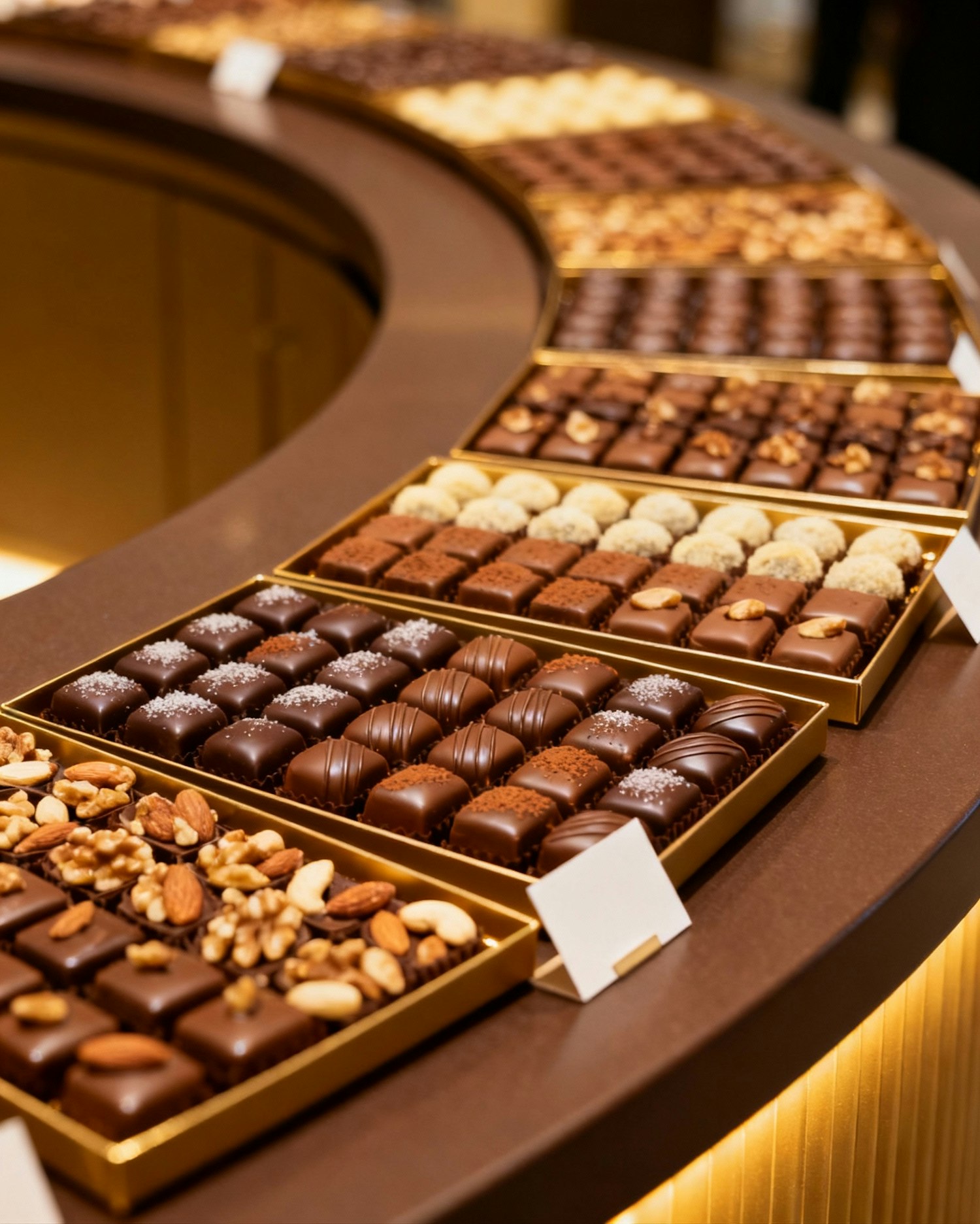A luxurious display of assorted chocolates in golden trays, featuring various toppings like nuts and sprinkles, on a curved counter.