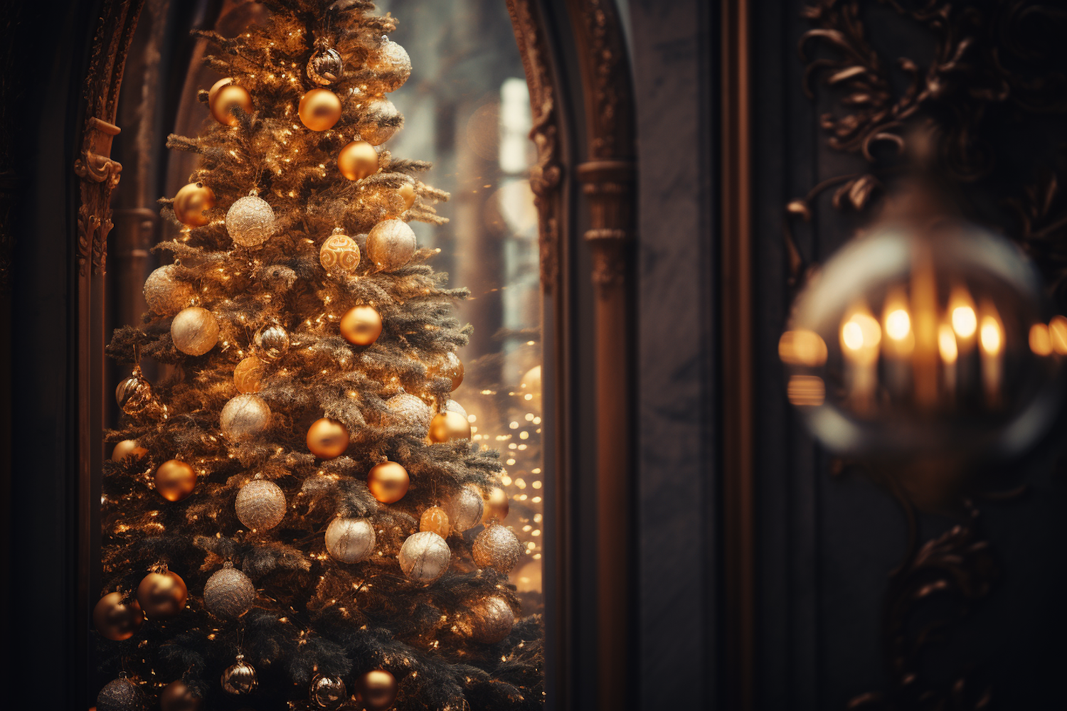 Elegant Christmas tree with golden ornaments and twinkling lights, reflected in ornate mirrors, creating a festive ambiance.