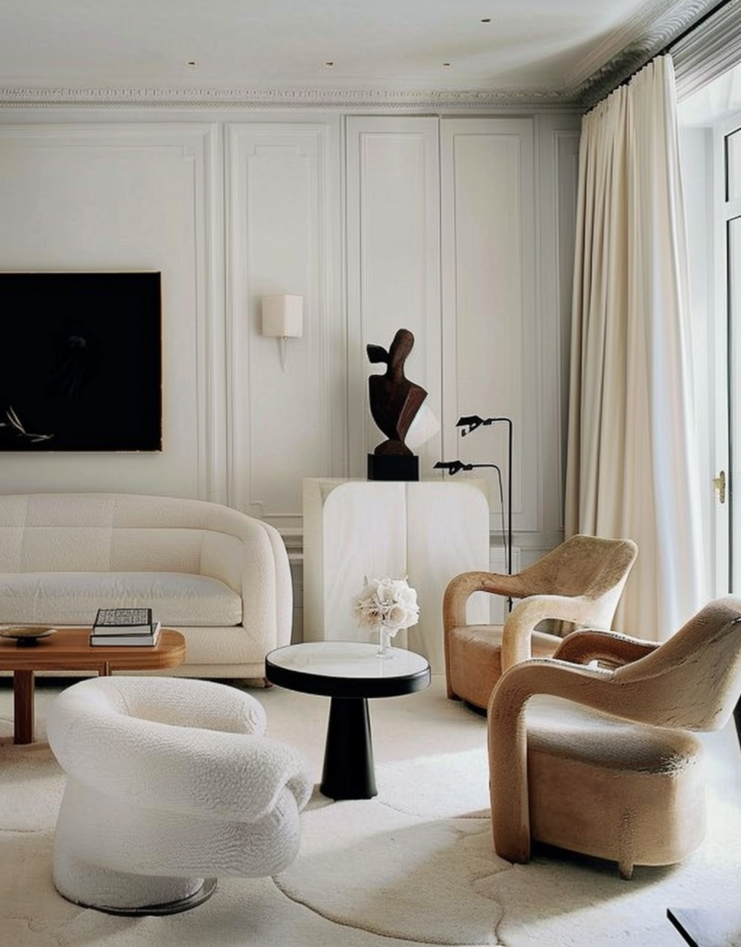 Elegant living room with cream furniture, abstract art, and modern decor. Features plush seating, a round table, and soft lighting.