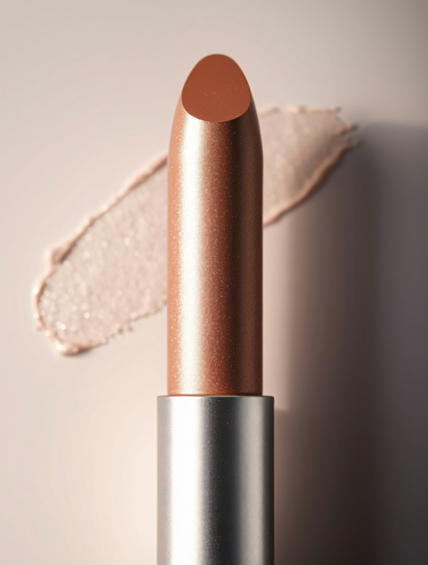 Close-up of a metallic bronze lipstick with a sleek silver casing and a soft background smear, highlighting its glossy texture.