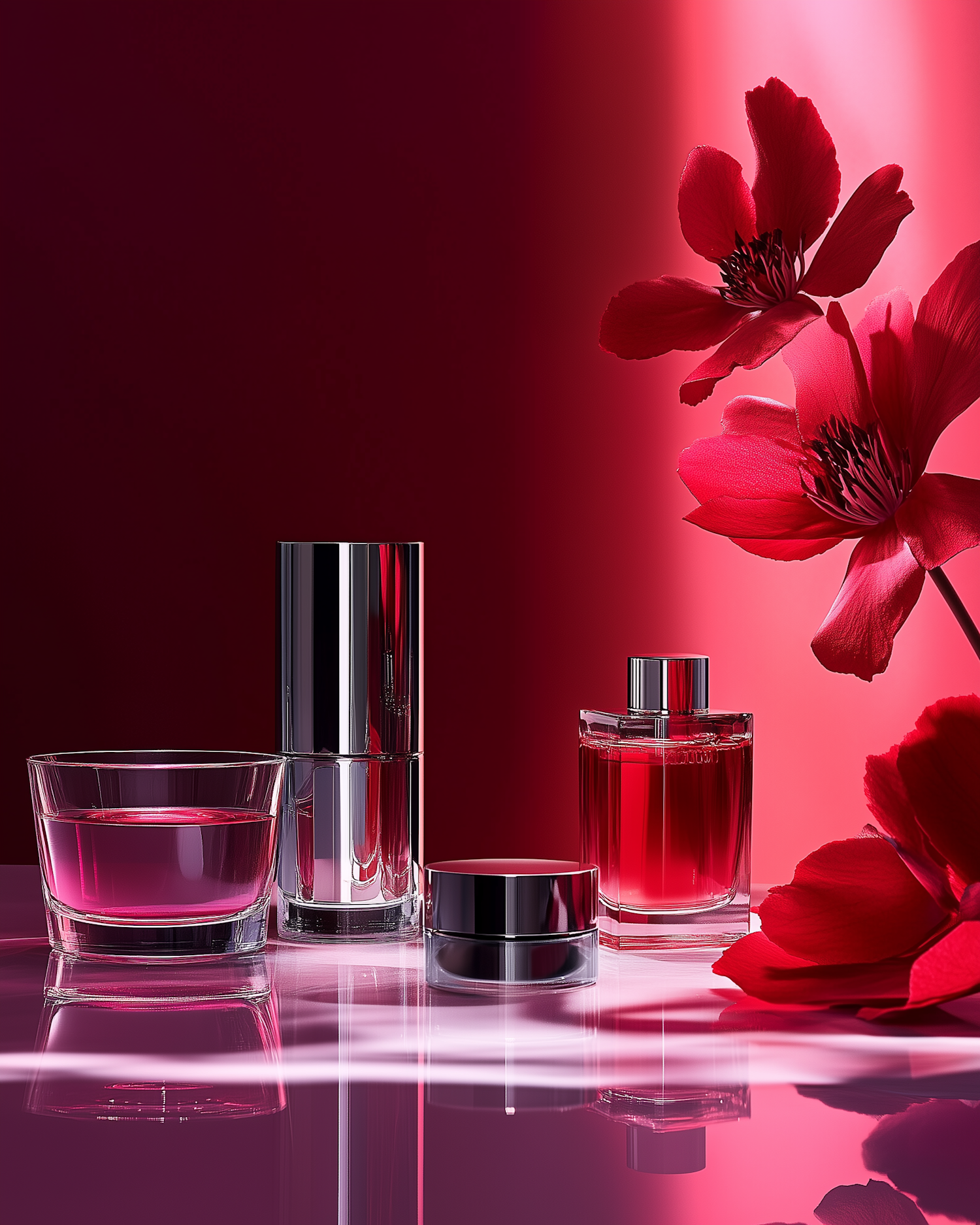 Luxurious cosmetic bottles with pink liquid and red flowers on a reflective surface, set against a deep red background.