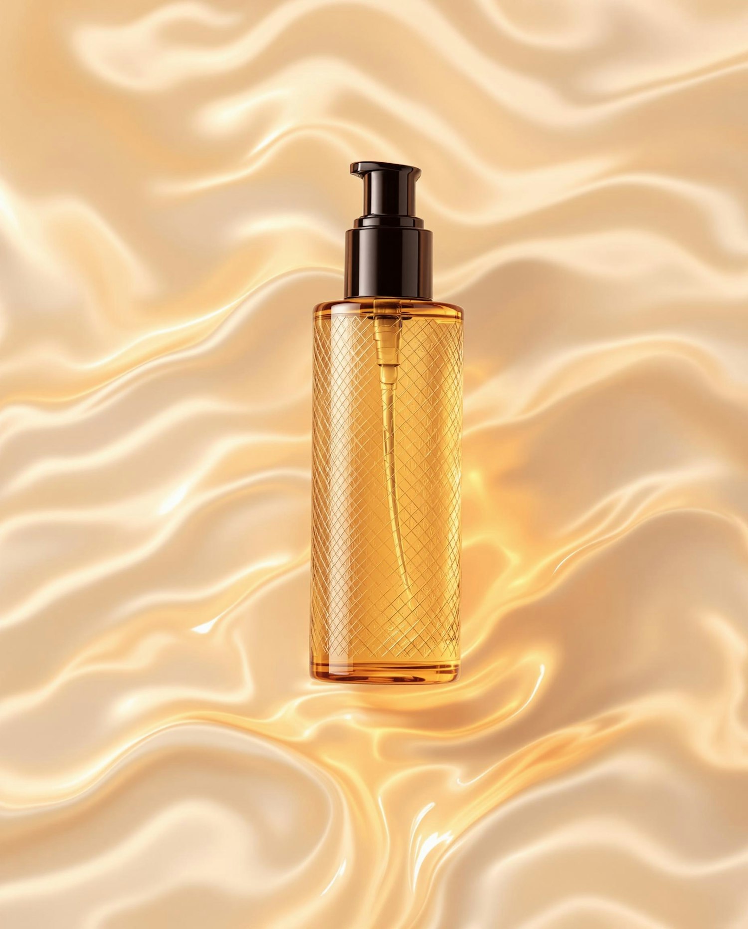 Elegant golden bottle with pump on a silky, glowing background, perfect for showcasing luxury skincare or beauty products.