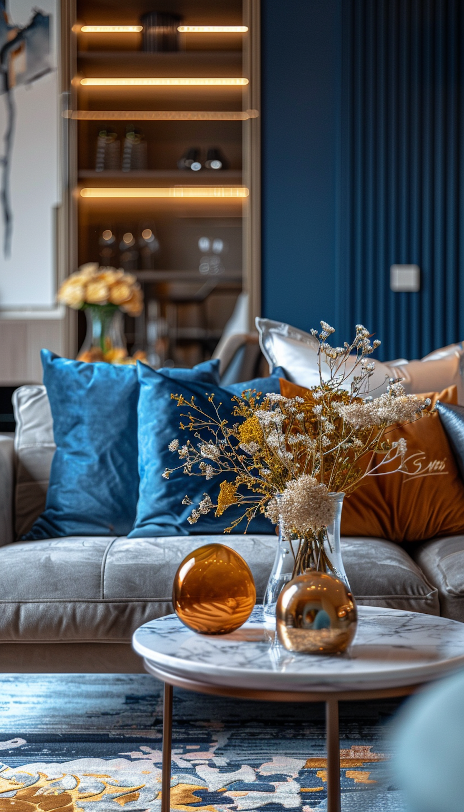 Modern living room with gray sofa, blue and orange cushions, marble table, and elegant decor in blue and gold tones.
