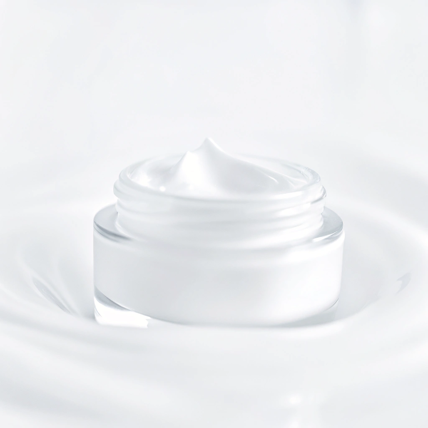 Minimalist close-up of a glass jar with smooth white cream, perfect for skincare or cosmetic product promotions.