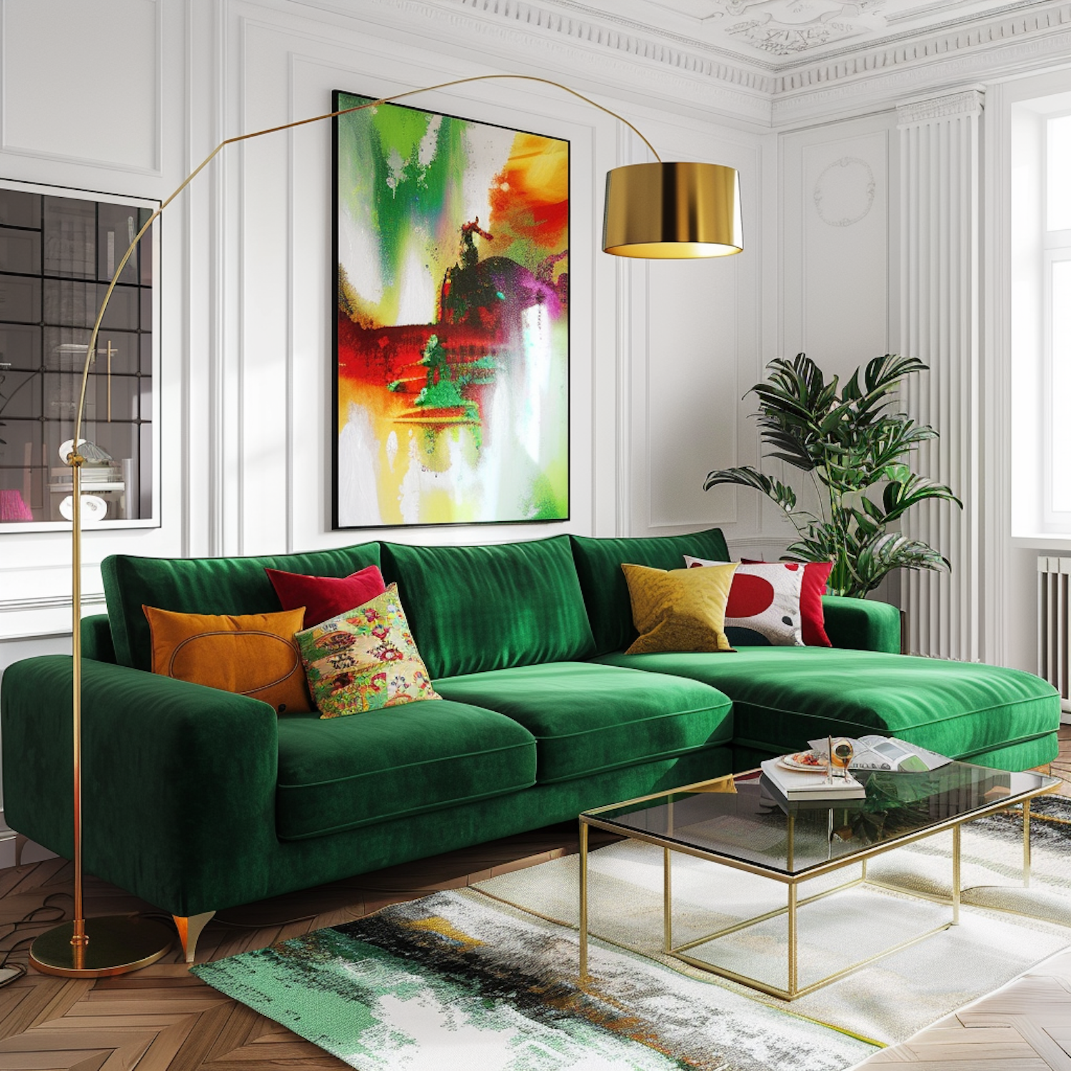 Luxurious living room with emerald green sofa, vibrant abstract art, gold accents, and lush plant for a chic, modern aesthetic.