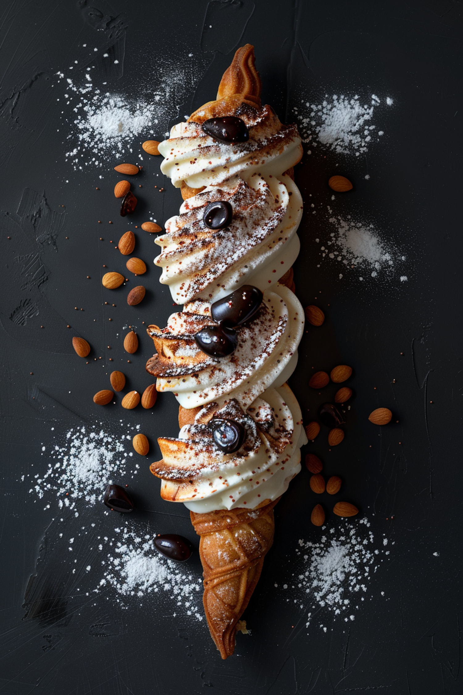 Elegant dessert with whipped cream, chocolate, almonds, and powdered sugar on a dark surface. Perfect for gourmet presentations.
