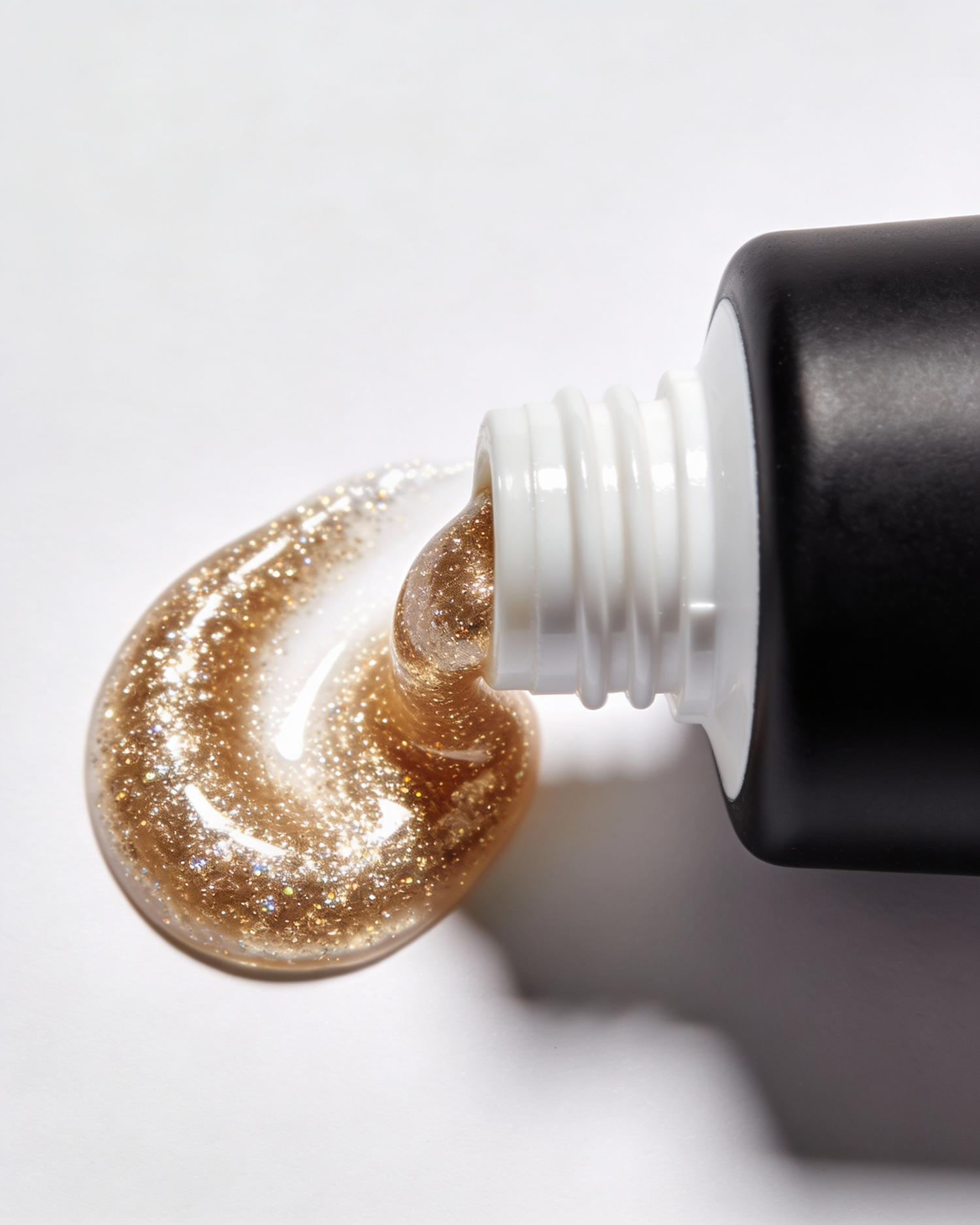 Golden glittery gel flowing from a black bottle onto a white surface, showcasing its luxurious texture and sparkle.