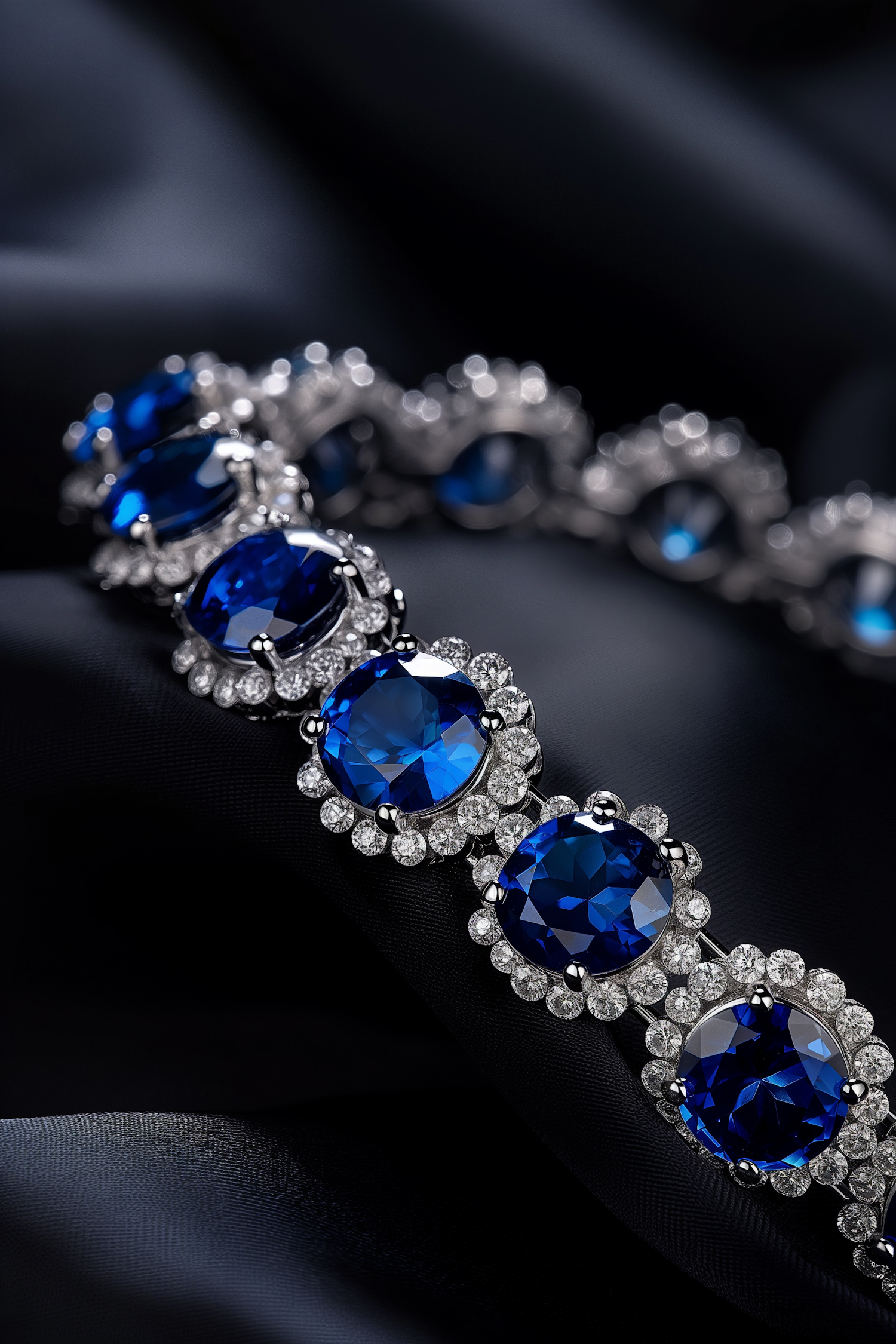 Elegant bracelet with deep blue sapphires and sparkling diamonds on dark fabric, showcasing luxury and sophistication.