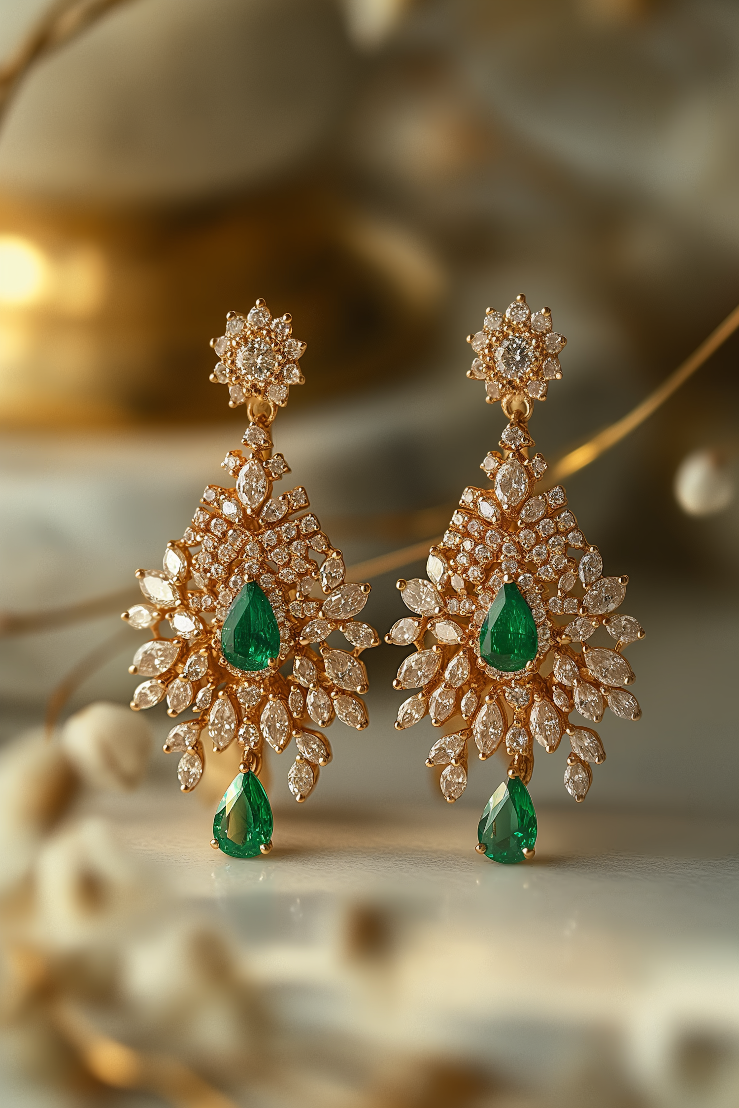 Elegant gold earrings with emerald and diamond floral design, featuring teardrop emeralds and marquise-cut diamonds.