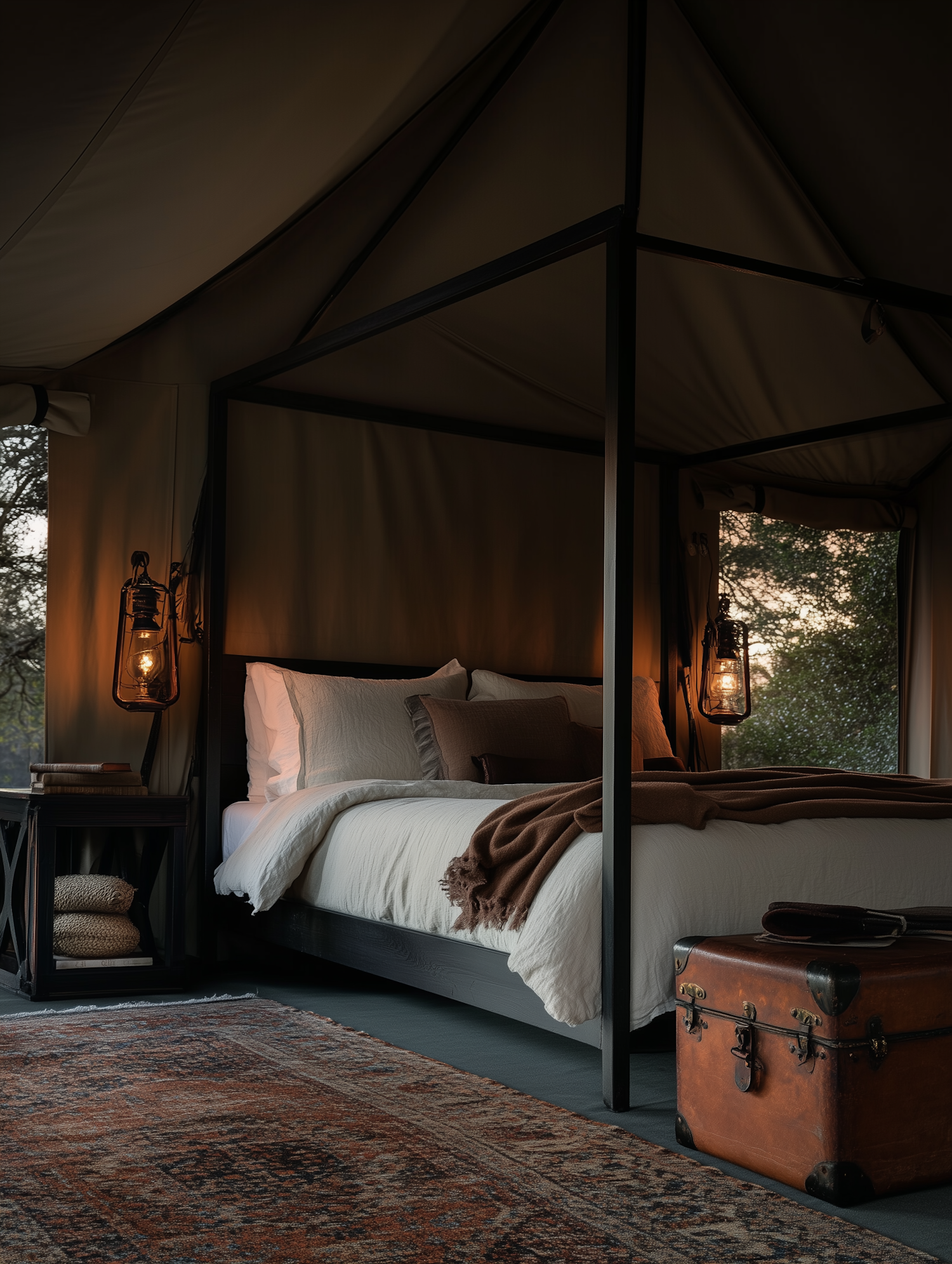 Luxurious glamping tent with a four-poster bed, vintage lanterns, a leather trunk, and a cozy, earthy vibe perfect for a nature retreat.