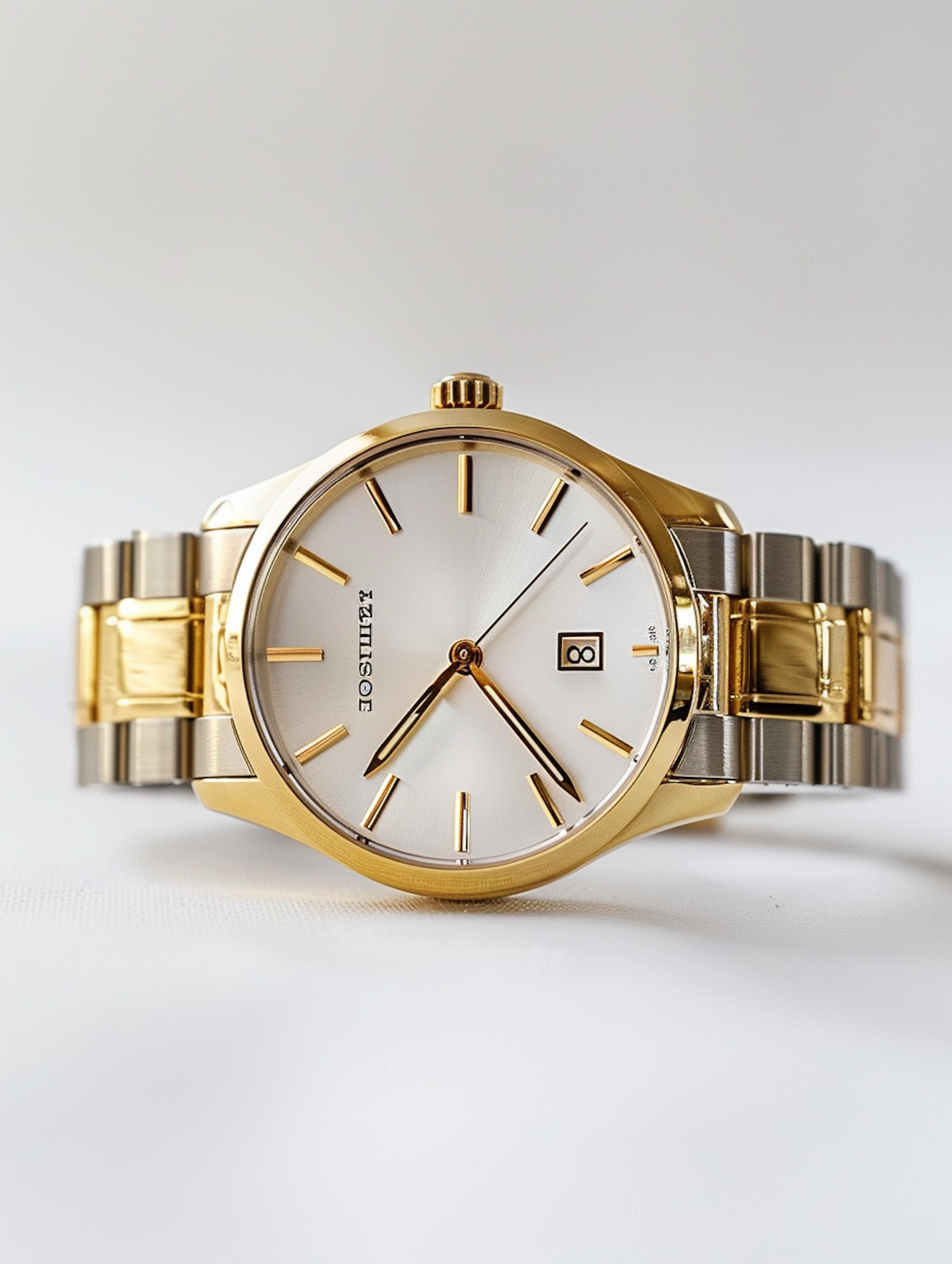Elegant gold and silver wristwatch with a white face and date window, showcasing luxury and precision.