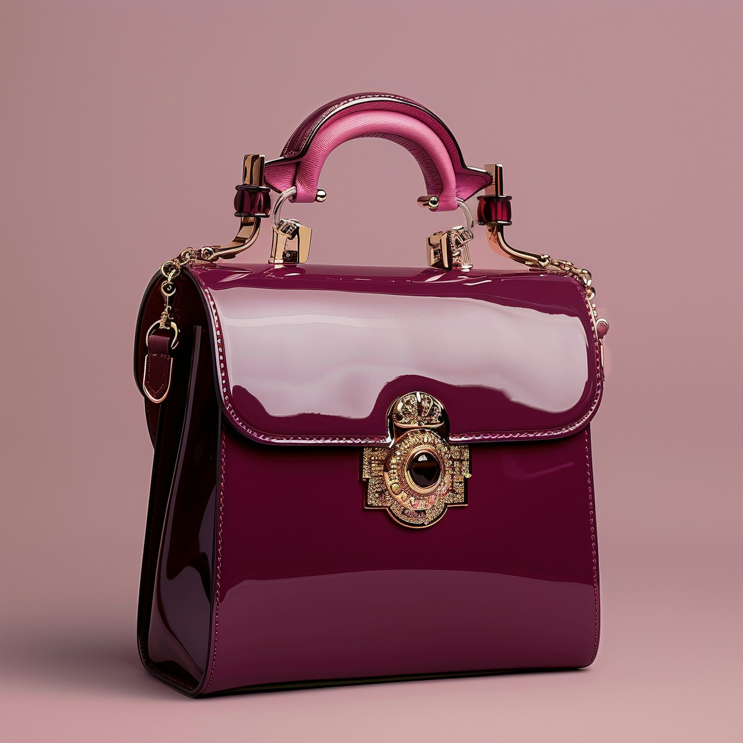 Luxurious burgundy handbag with gold hardware and intricate clasp, set against a soft pink background. Elegant and sophisticated design.