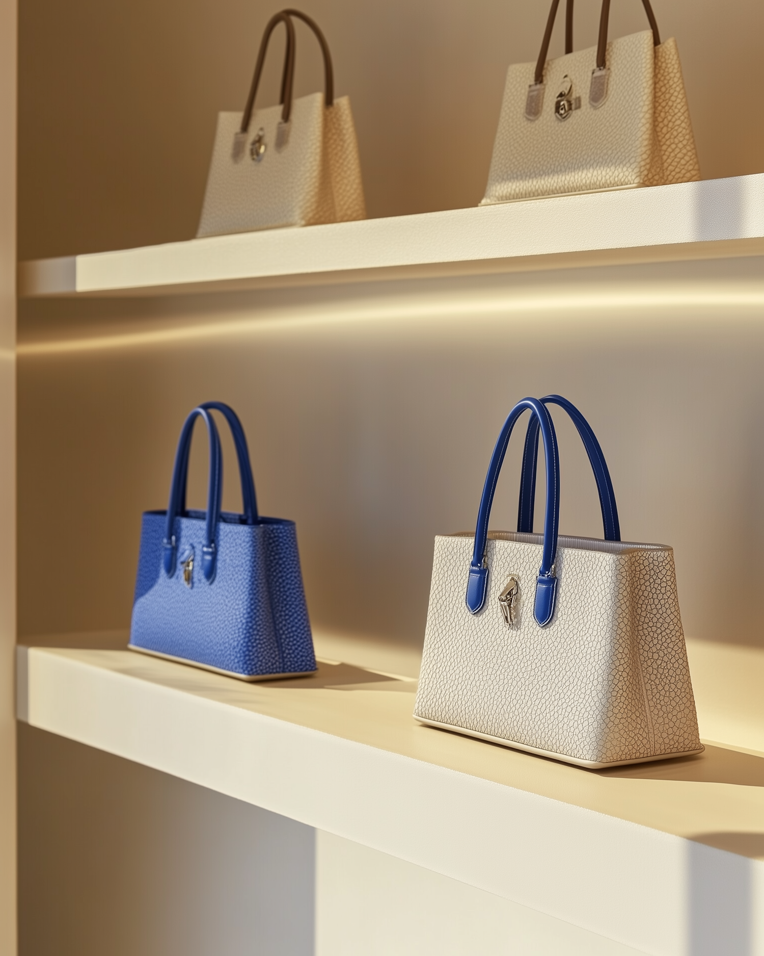 Elegant handbags on illuminated shelves, featuring beige and blue designs with textured leather and metallic accents.