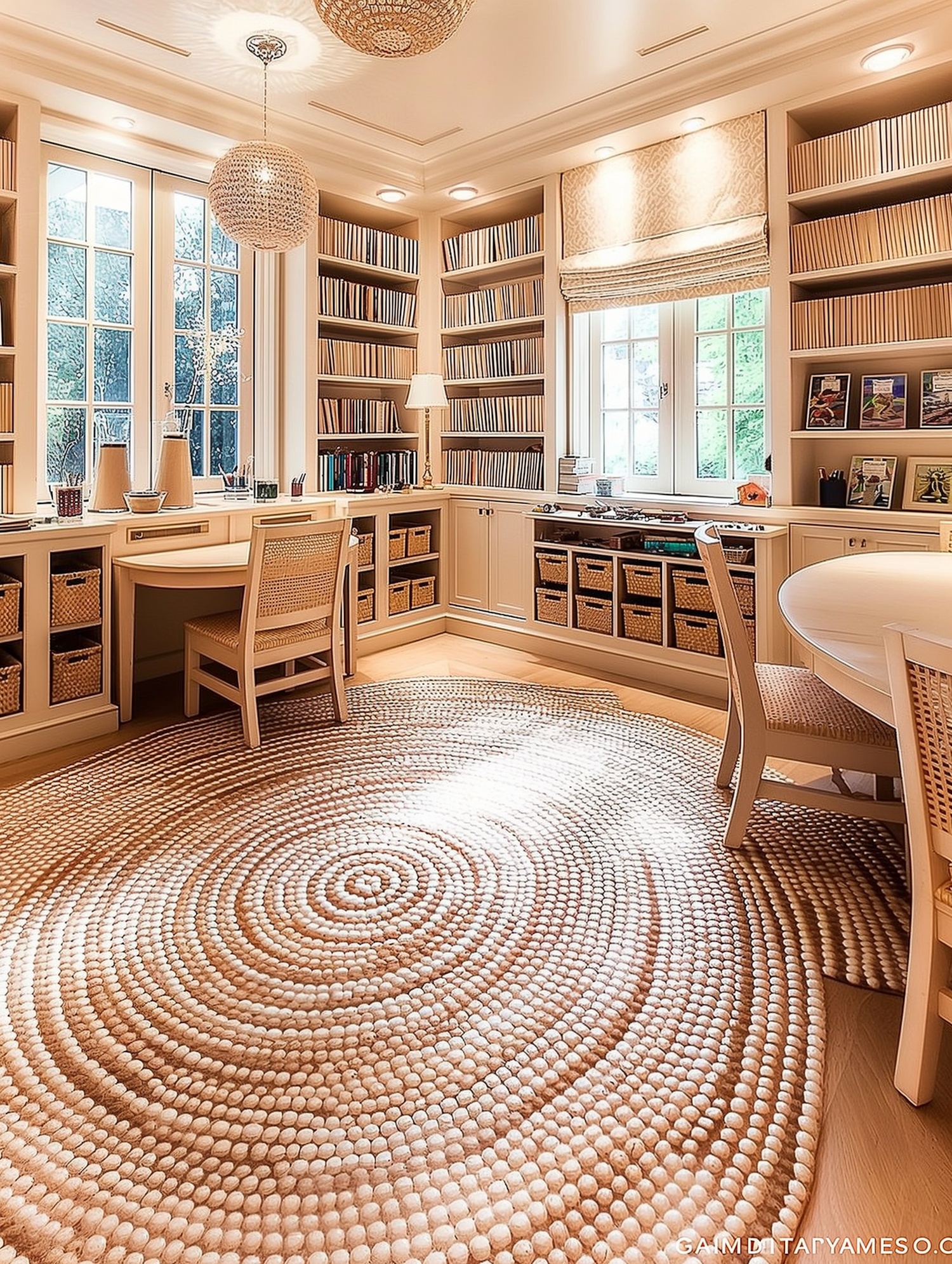 Elegant home office with built-in bookshelves, a large window, and a textured rug. Warm, neutral tones create a cozy atmosphere.