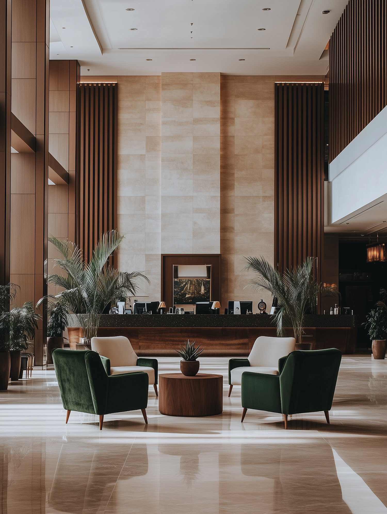 Modern hotel lobby with green velvet chairs, marble floors, and a sleek reception desk. Perfect blend of luxury and comfort.