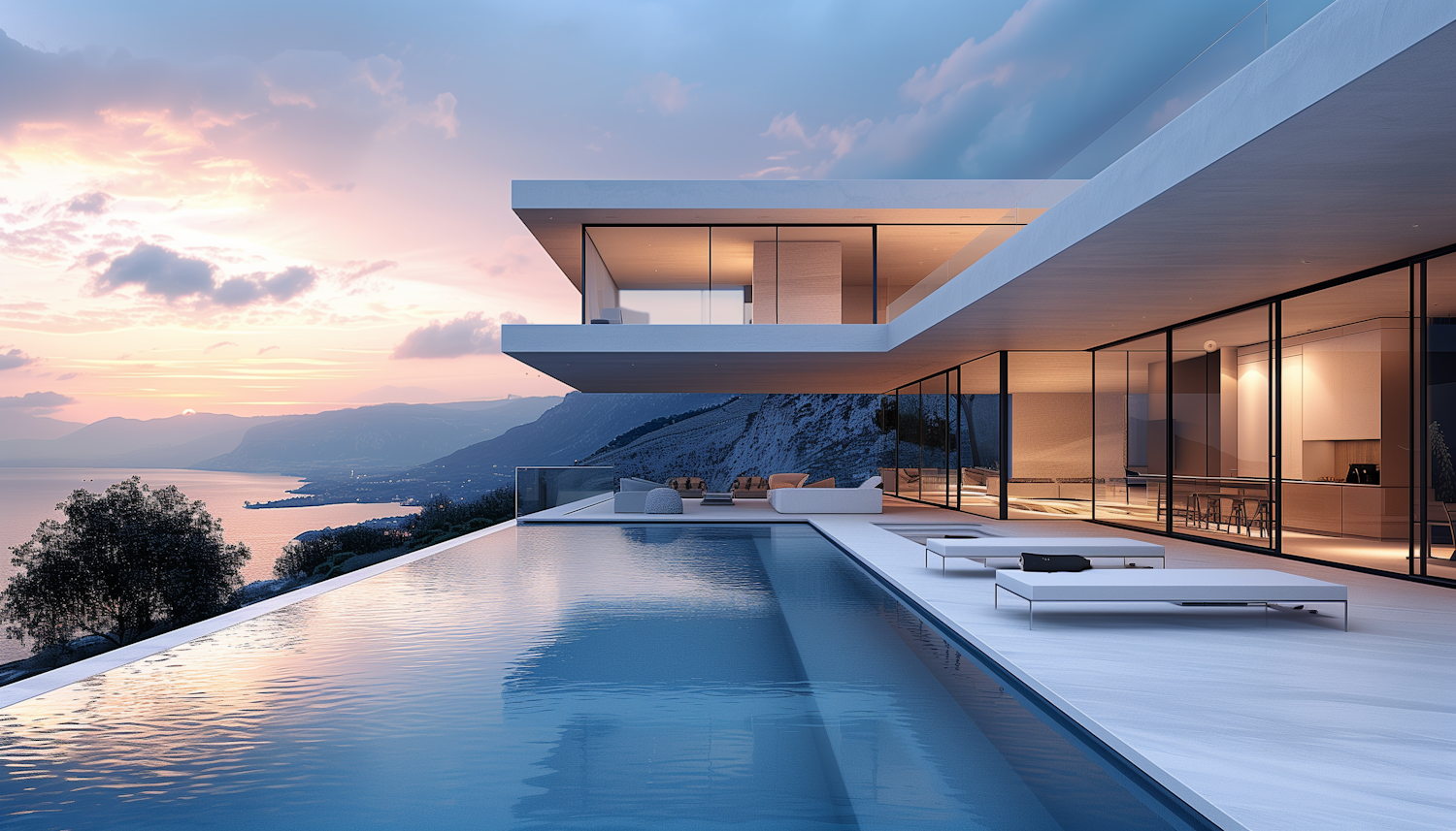 Modern luxury house with infinity pool and stunning sunset view over mountains and sea. Sleek design with glass walls and minimalist decor.