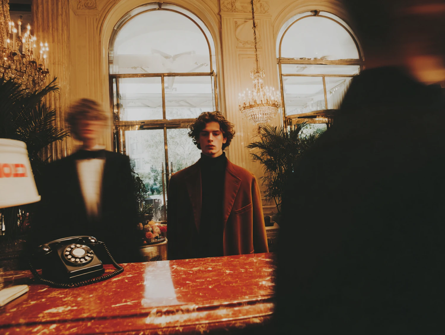 A stylish young man in a luxurious setting with chandeliers and a vintage phone, surrounded by blurred figures in motion.
