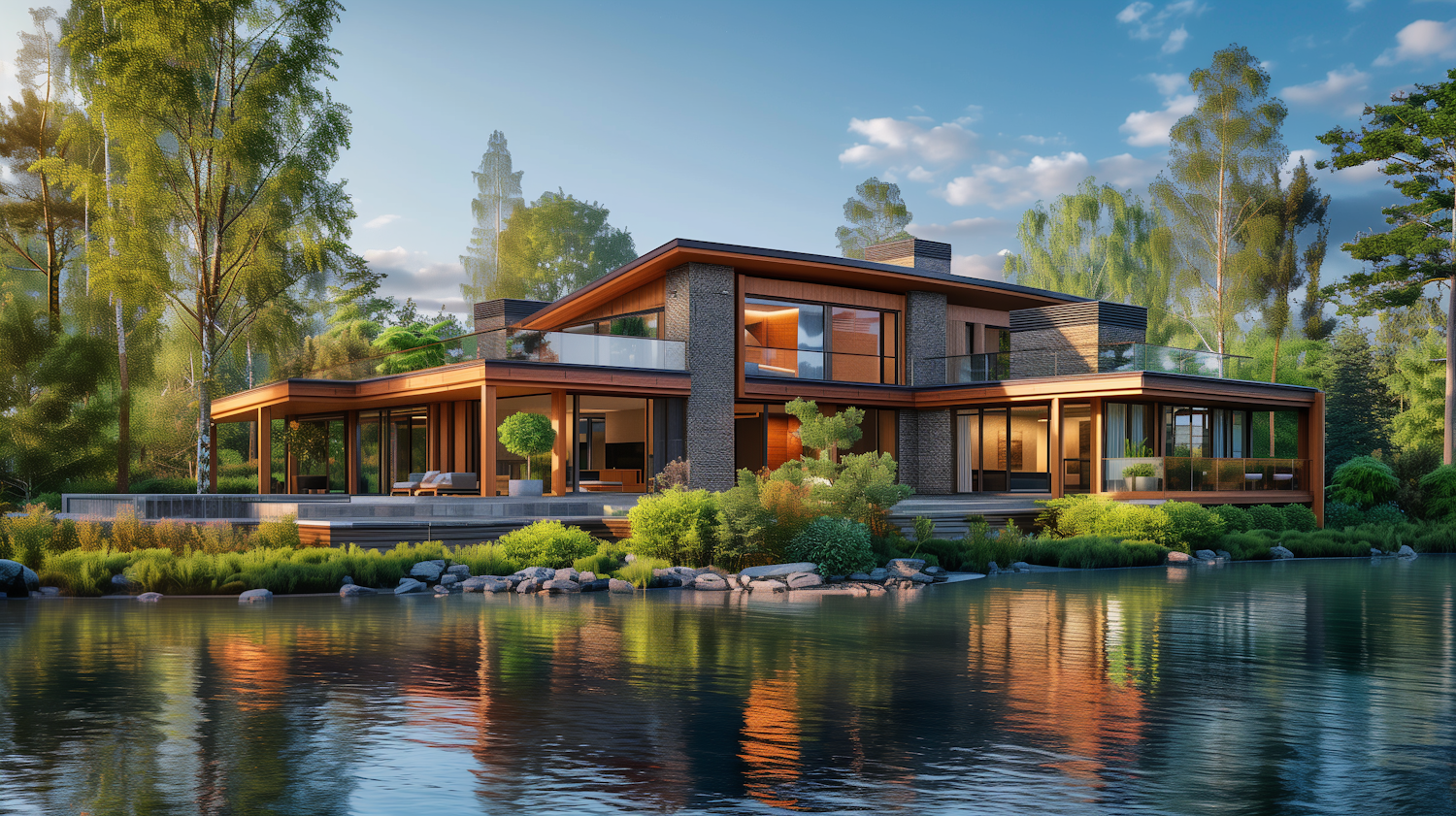 Modern lakeside house with large windows, wood and stone design, surrounded by lush greenery and reflected in calm water.