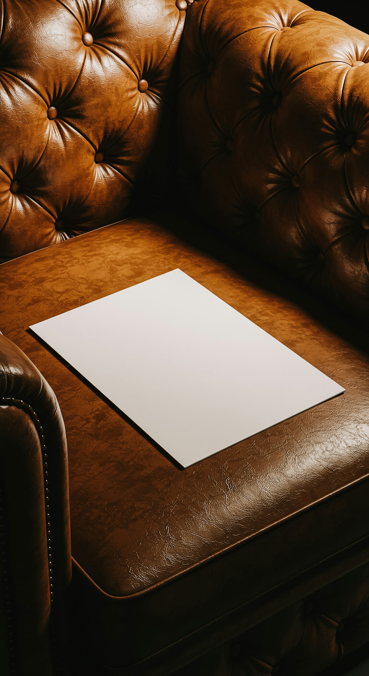 A blank white sheet of paper on a rich brown tufted leather armchair, creating a striking contrast in a warm, elegant setting.