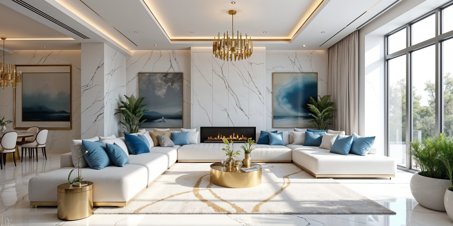 Modern living room with white sectional sofa, gold accents, marble walls, and floor-to-ceiling windows for a bright, elegant ambiance.