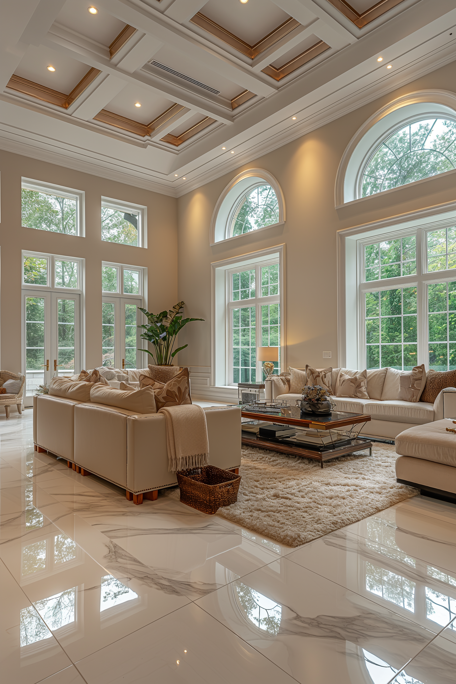 Luxurious living room with high ceilings, marble floors, and large windows. Cream sofas and modern decor create an elegant ambiance.