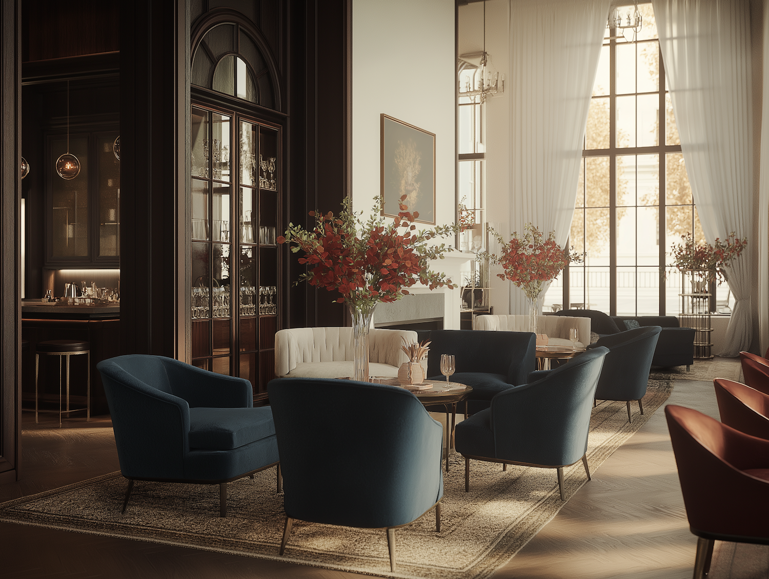 Elegant lounge with blue and white chairs, floral decor, and a cozy bar area. Natural light streams through tall windows with sheer curtains.
