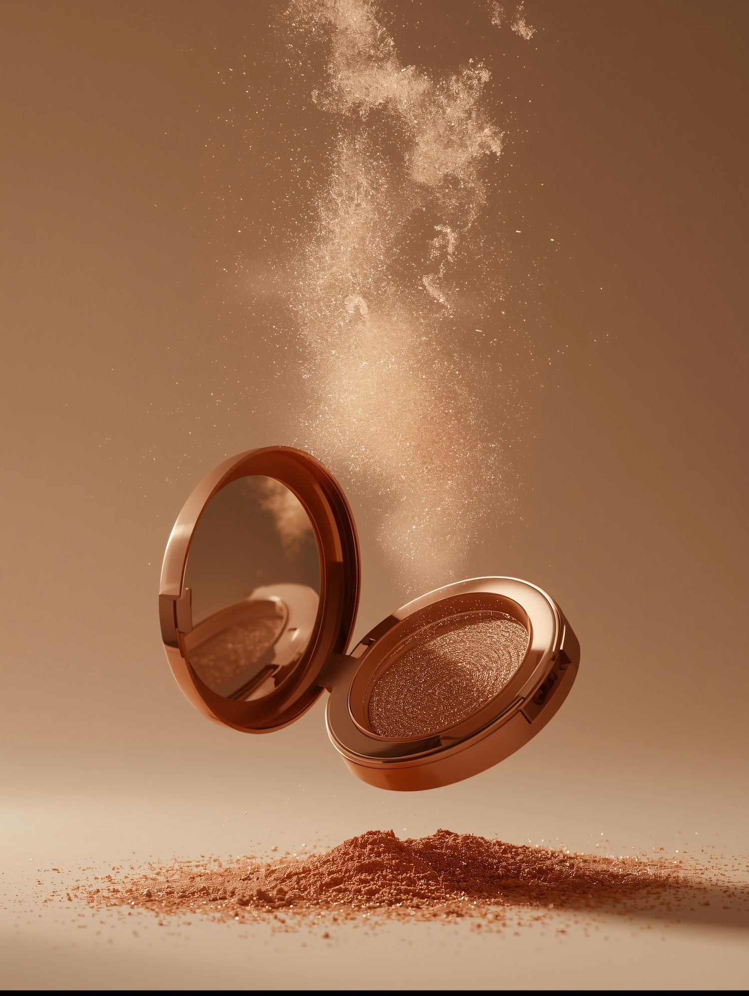 A luxurious compact makeup case with shimmering powder spilling out, set against a warm golden background for a glamorous look.
