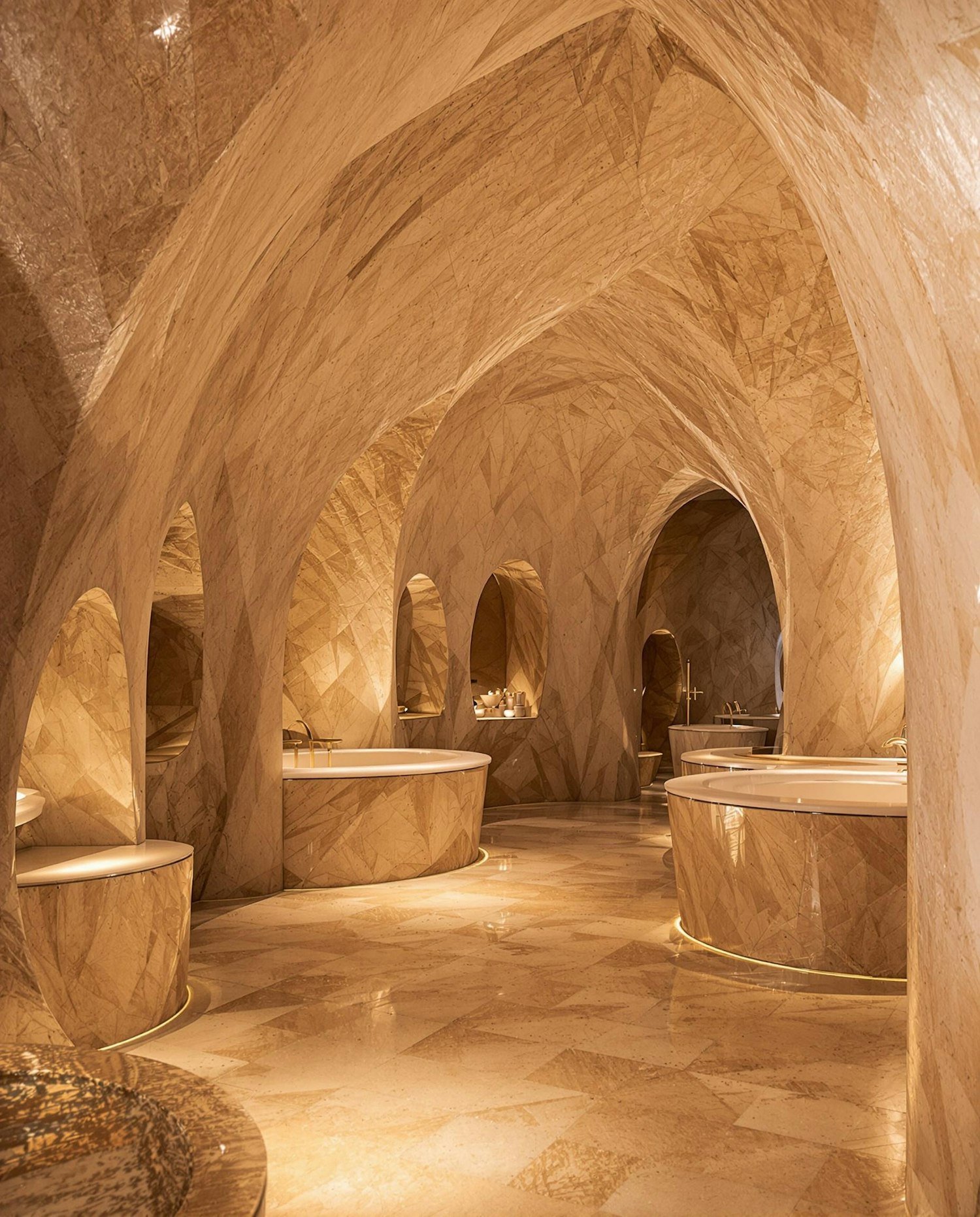Luxurious marble interior with geometric patterns, rounded bathtubs, and warm lighting creating an opulent, spa-like ambiance.