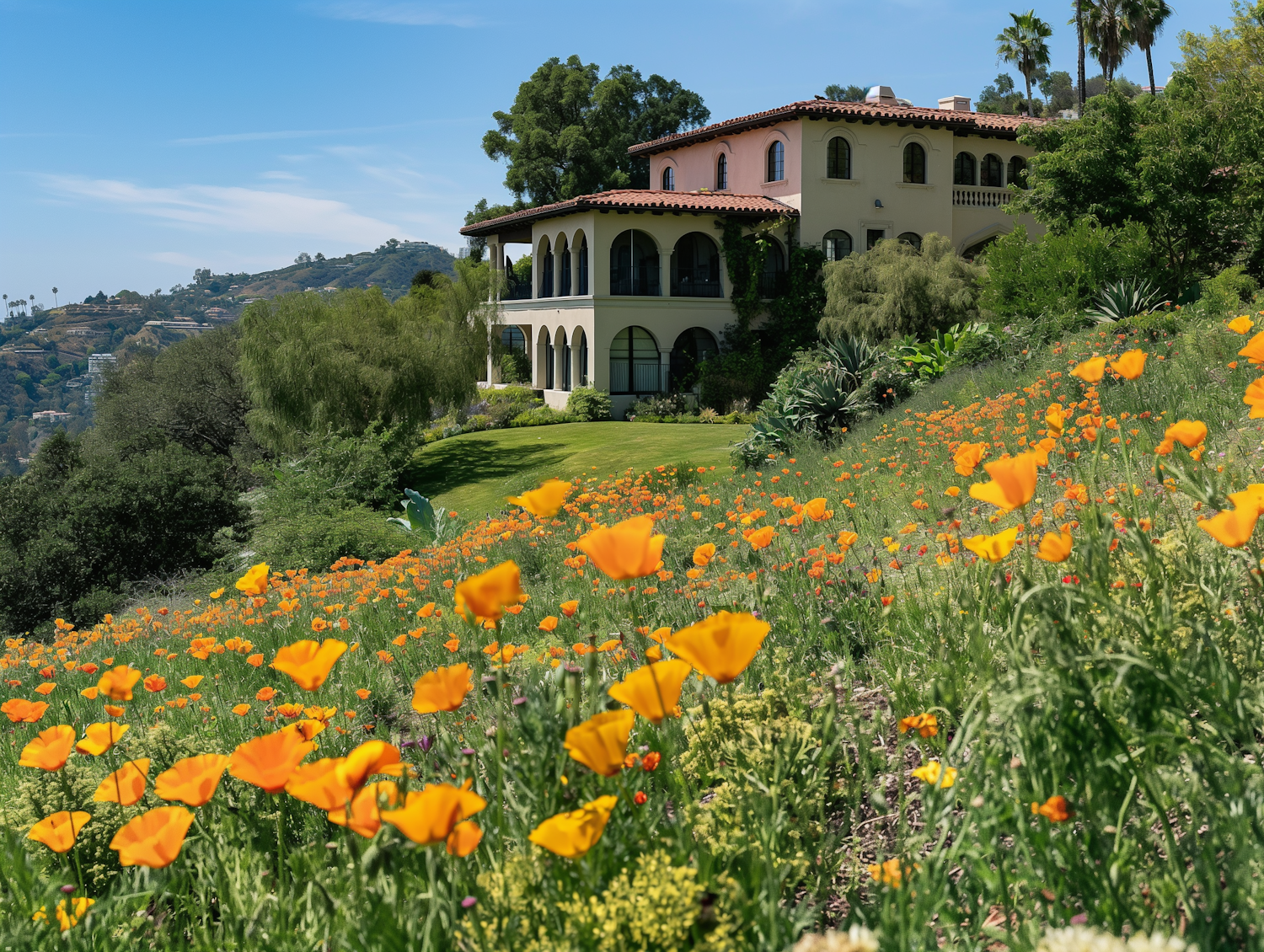 Mediterranean villa on a hillside with vibrant orange poppies and lush greenery under a clear blue sky.