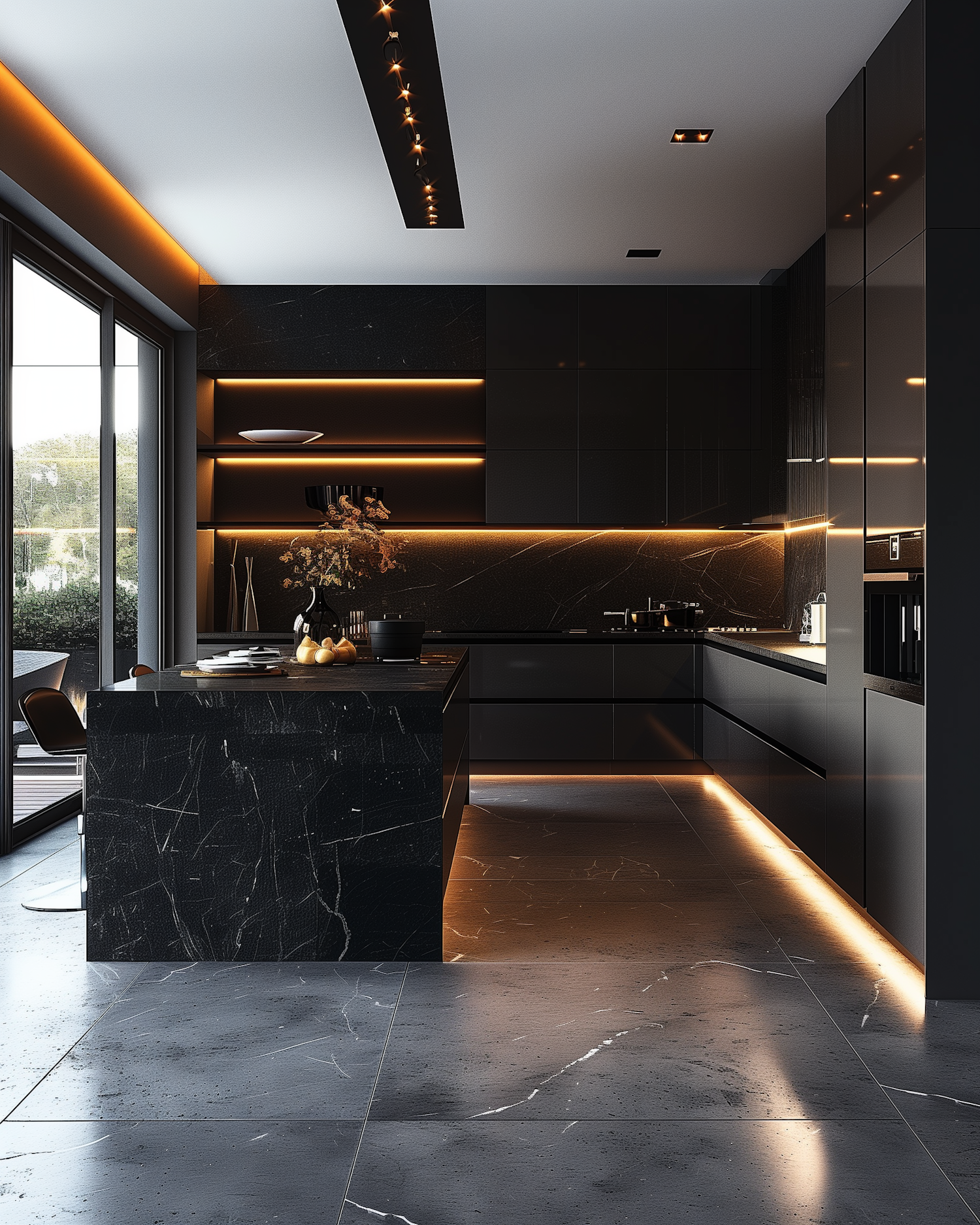 Sleek modern kitchen with dark cabinets, marble island, ambient lighting, and large windows for natural light.