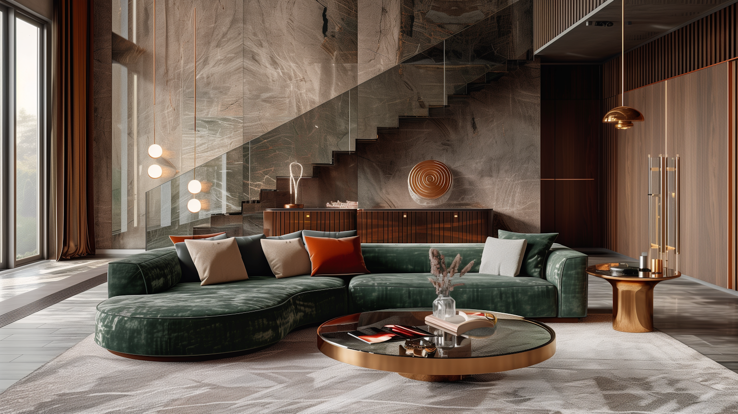 Luxurious living room with green velvet sofa, marble wall, and gold accents. Modern design with ambient lighting and natural light.