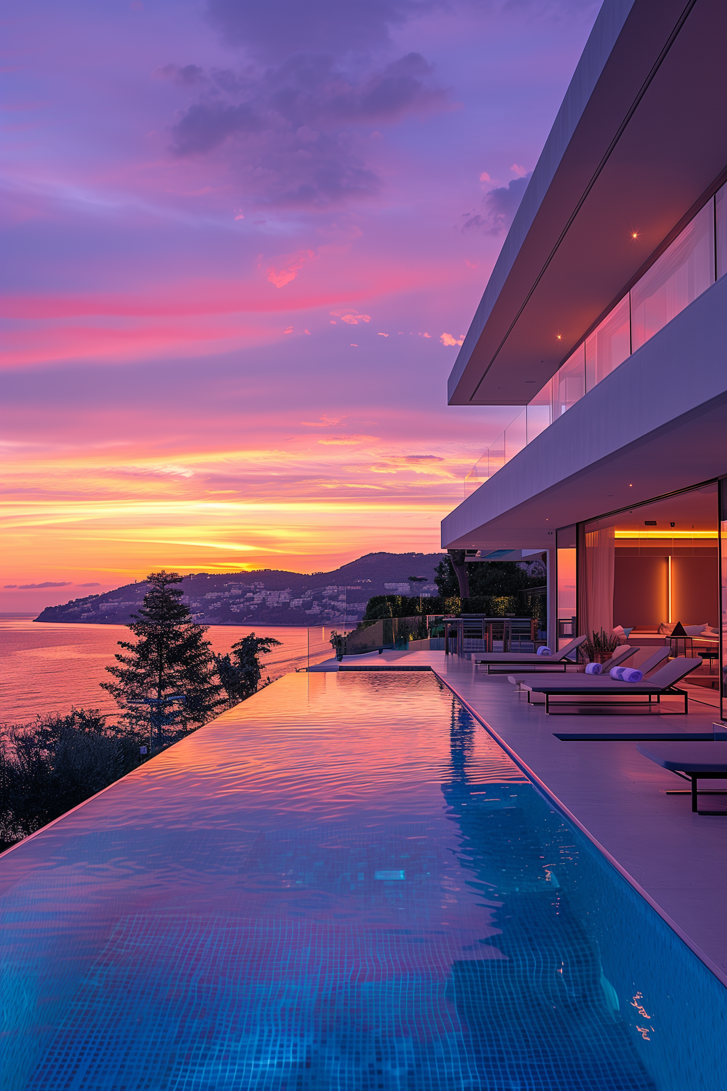 Luxurious villa with infinity pool at sunset, vibrant sky colors, sleek architecture, and ocean view for a serene retreat.
