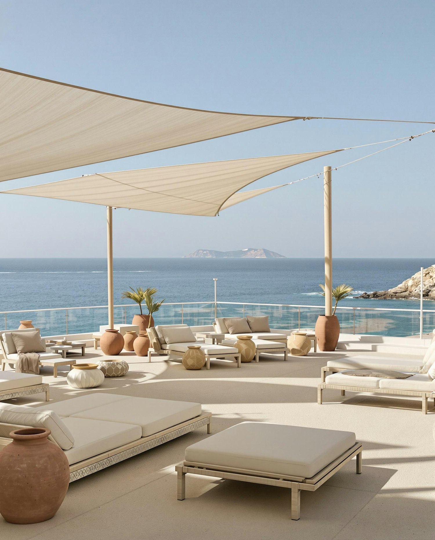 Elegant outdoor lounge with cream furniture, terracotta pots, and ocean views under beige canopies. Perfect for a serene coastal retreat.