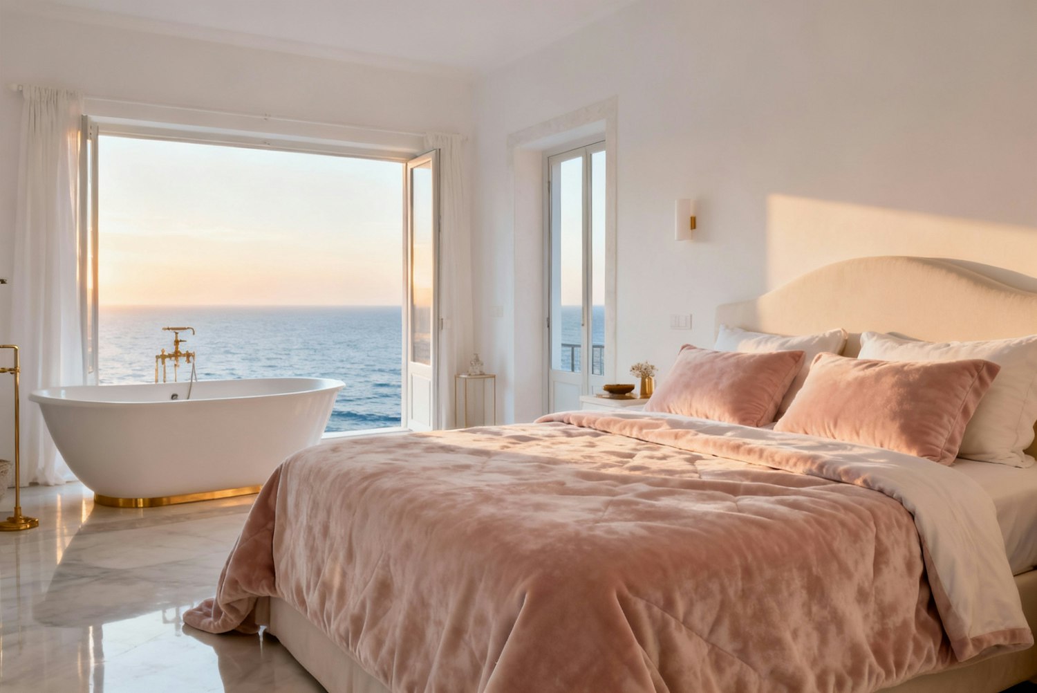 Photographed with soft and warm lighting, cinematic composition, high end editorial style, no people — A serene, spacious bedroom space in a luxury Mediterranean style villa in Barbados. There is a beautiful ocean view. There is a king-size bed with plush bedding including a velvet quilt and matching pillows in a natural pale warm neutral shade, and there is a freestanding bathtub. The walls of the space are painted a soft white tone. The colour scheme in the space is centred around white, cream and pale pink, with subtle touches of gold for a luxe feel. Decorative items are incorporated sparingly, which maintains a clutter-free and refined ambience. The overall mood is minimal, elegant and tranquil.