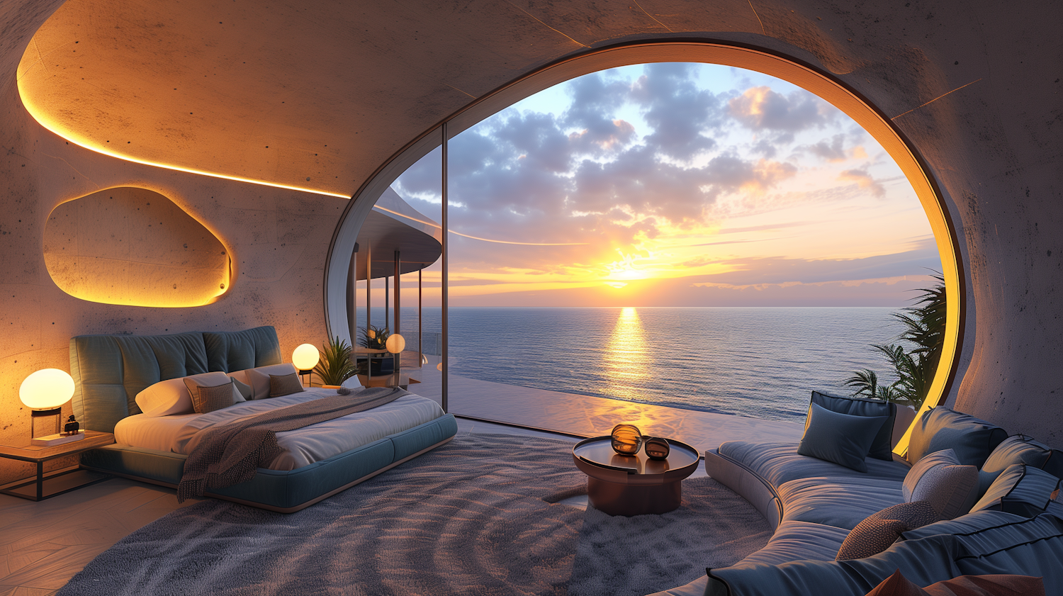 Luxurious bedroom with ocean view, modern design, ambient lighting, and sunset reflections. Perfect blend of comfort and style.