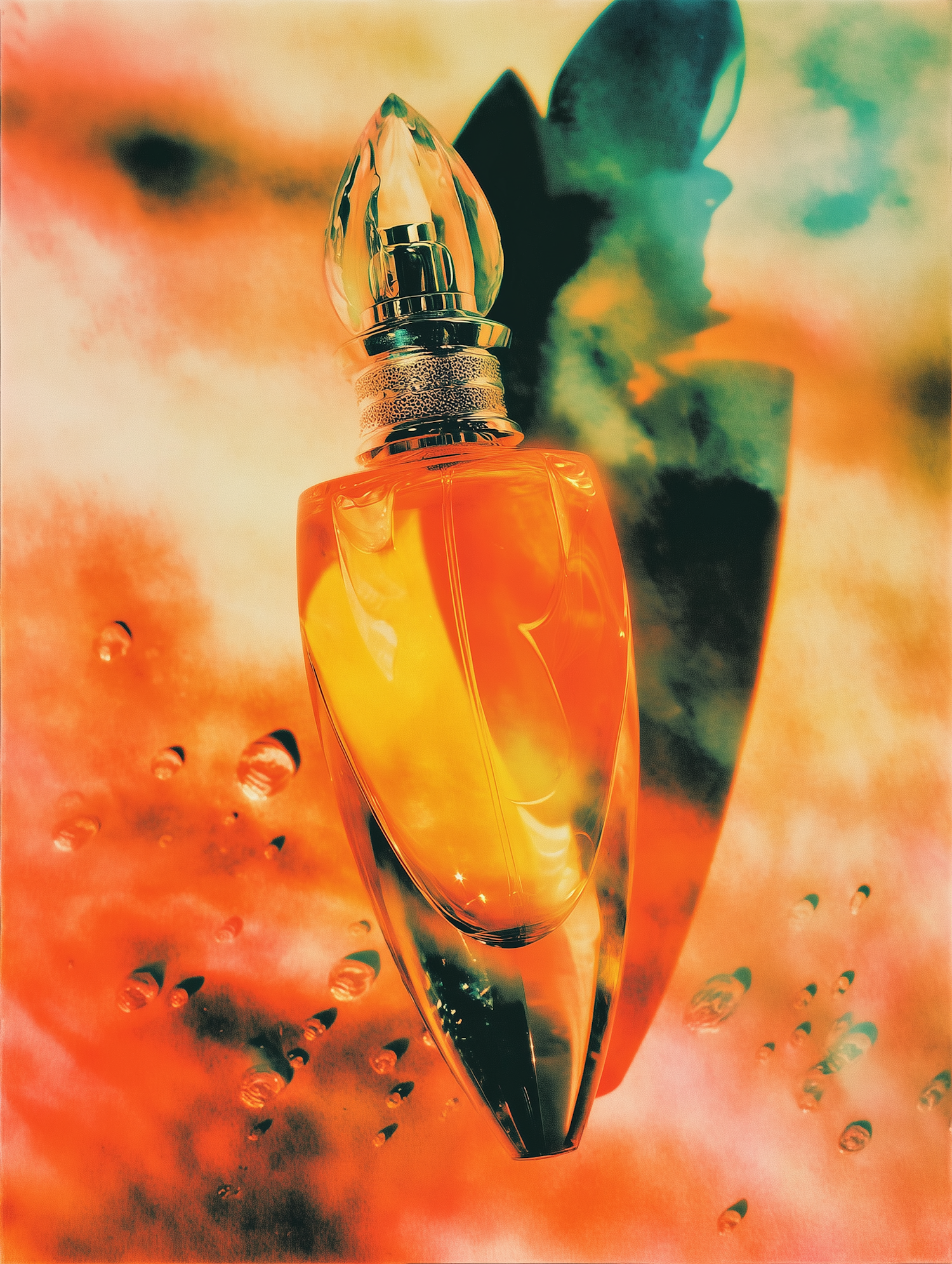 A luxurious perfume bottle with golden liquid, crystal cap, and metallic details, set against a vibrant, abstract background.