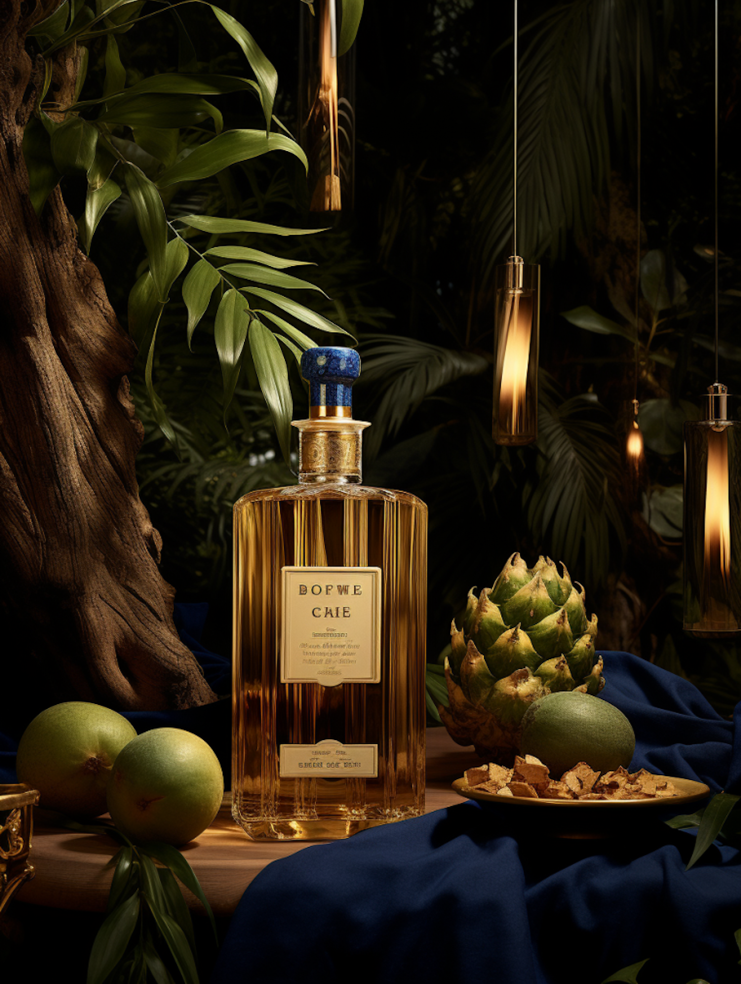 Luxurious liquor bottle amidst tropical foliage, with fruits and warm lighting creating an opulent atmosphere.