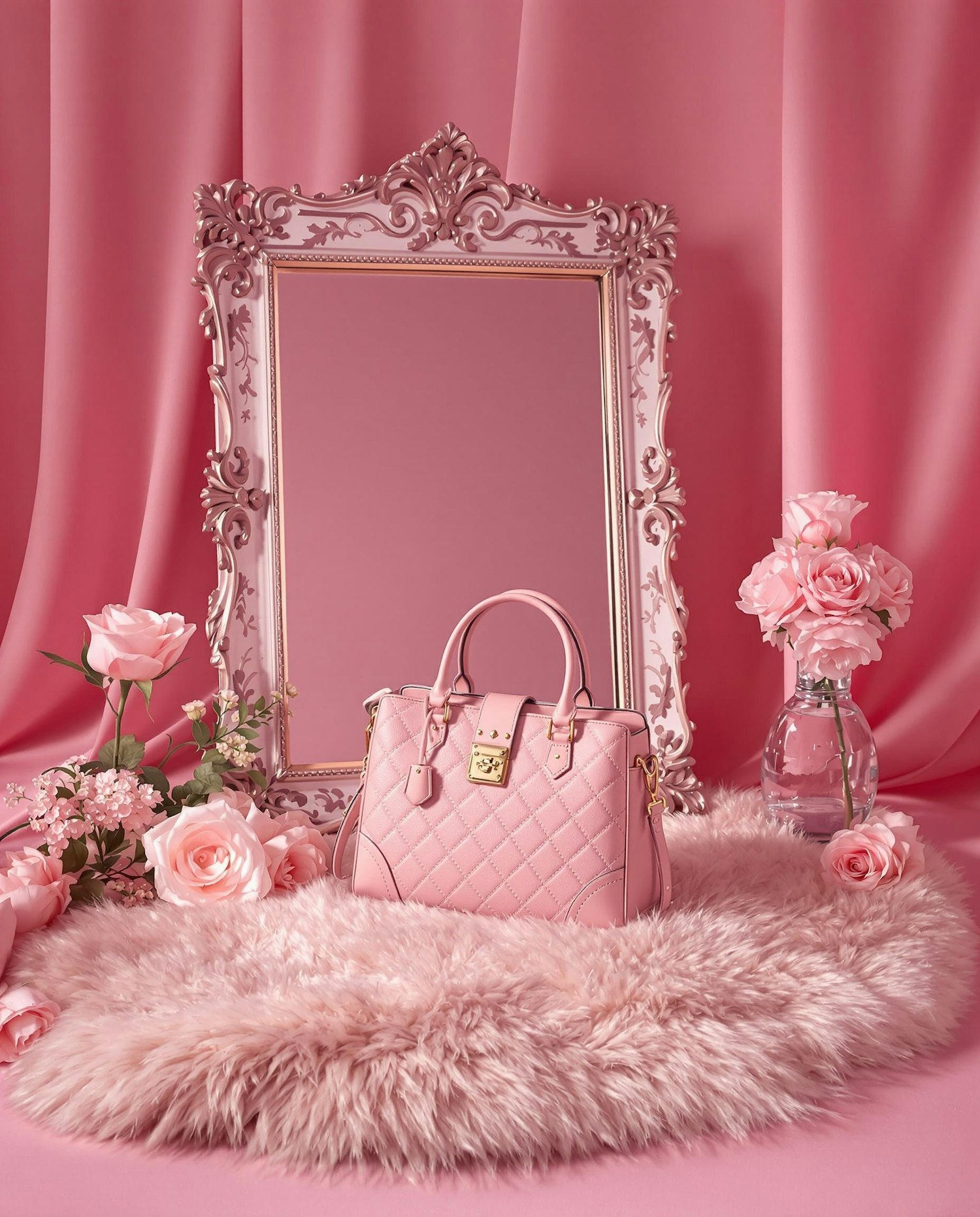 Soft pink handbag with roses, a fur surface, and an ornate pink mirror creating an elegant scene.