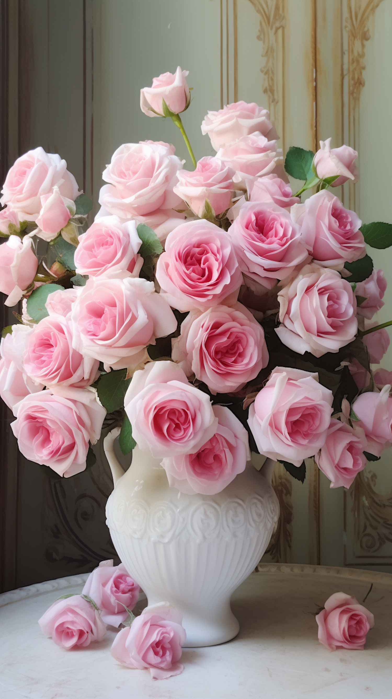 Elegant bouquet of pink roses in a white vase against a vintage backdrop, exuding timeless beauty and charm.