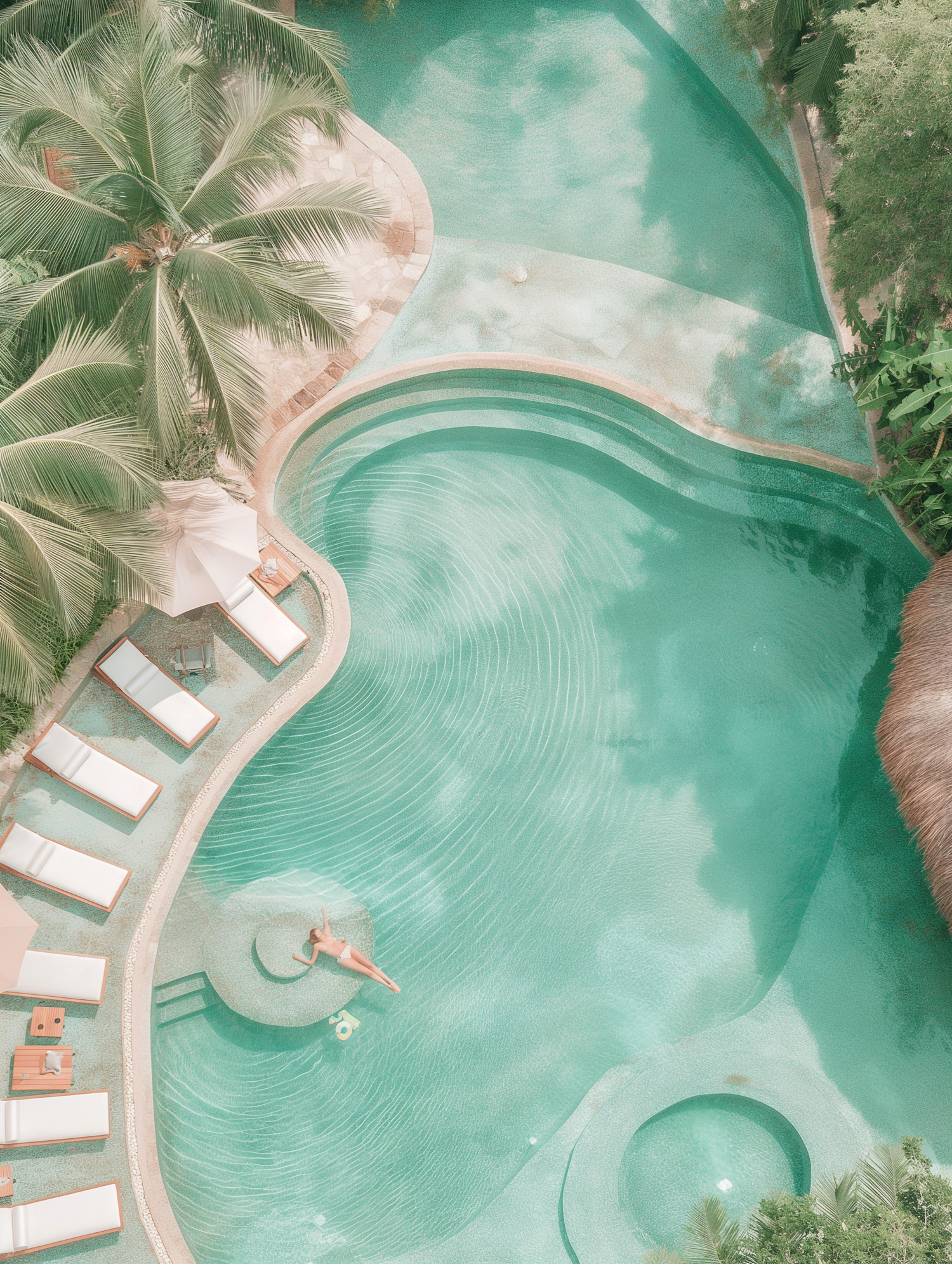 Aerial view of a tropical pool with curved design, surrounded by palm trees and sun loungers, featuring a person relaxing on a central island.