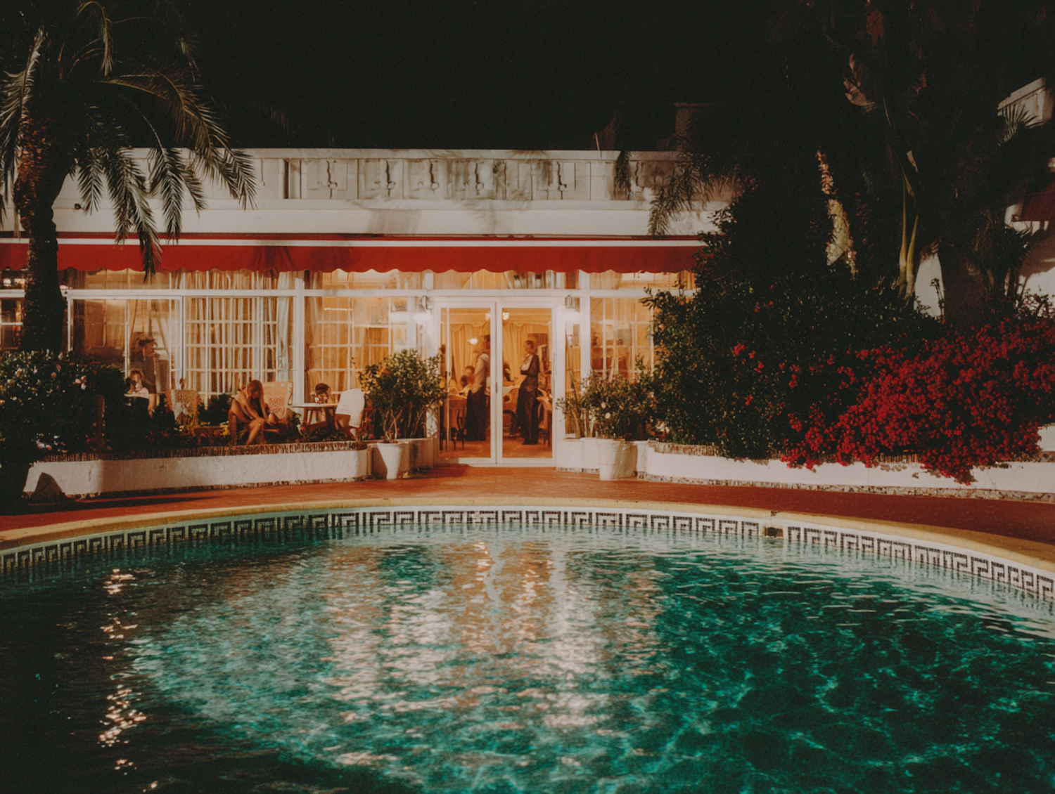 A nighttime poolside view with a lit building, lush greenery, and people enjoying the ambiance, creating a warm and inviting atmosphere.