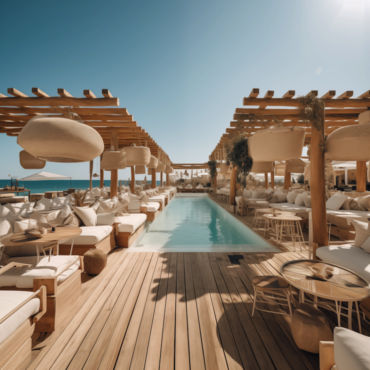 Luxurious beachside lounge with a pool, plush sunbeds, and elegant wooden pergolas under a clear blue sky.